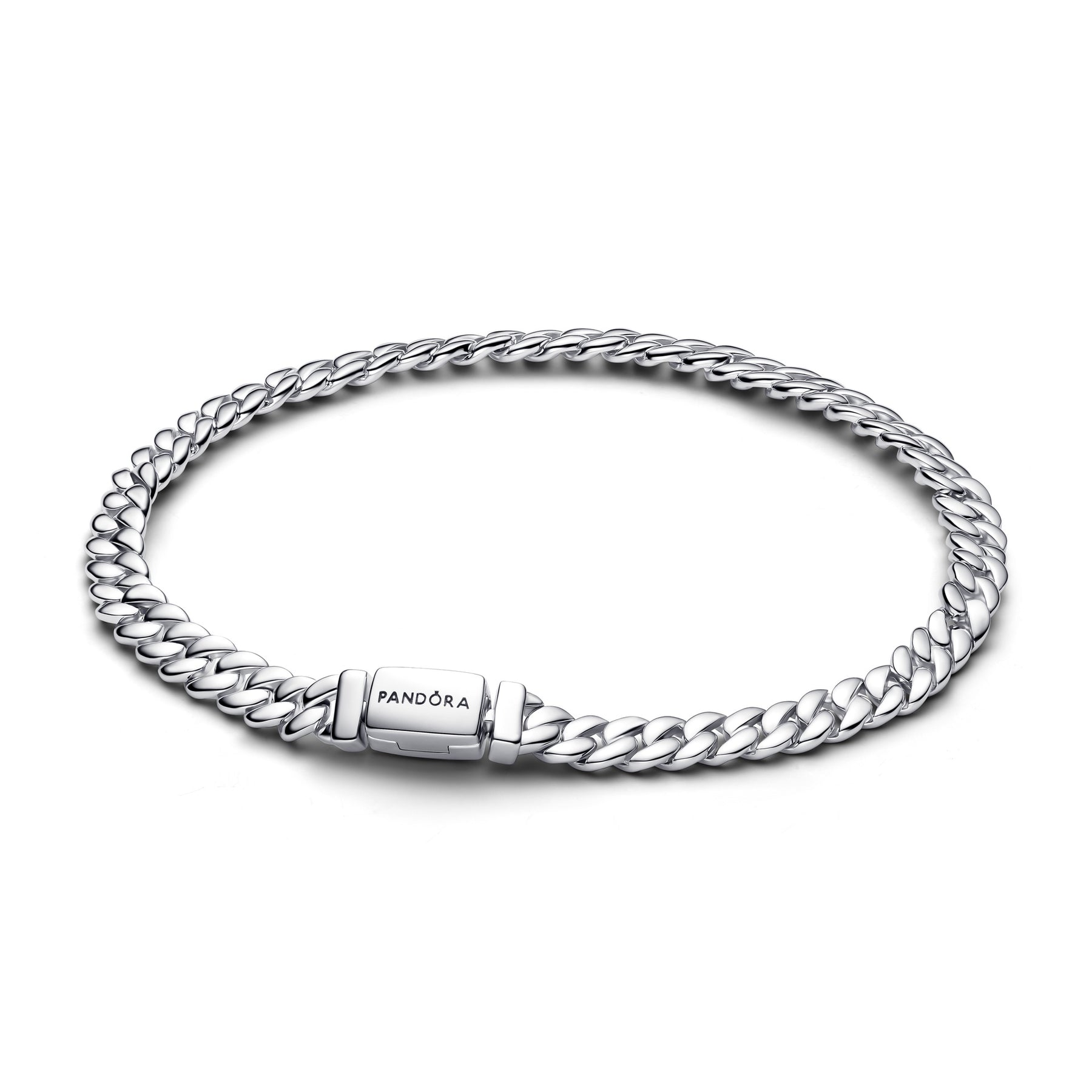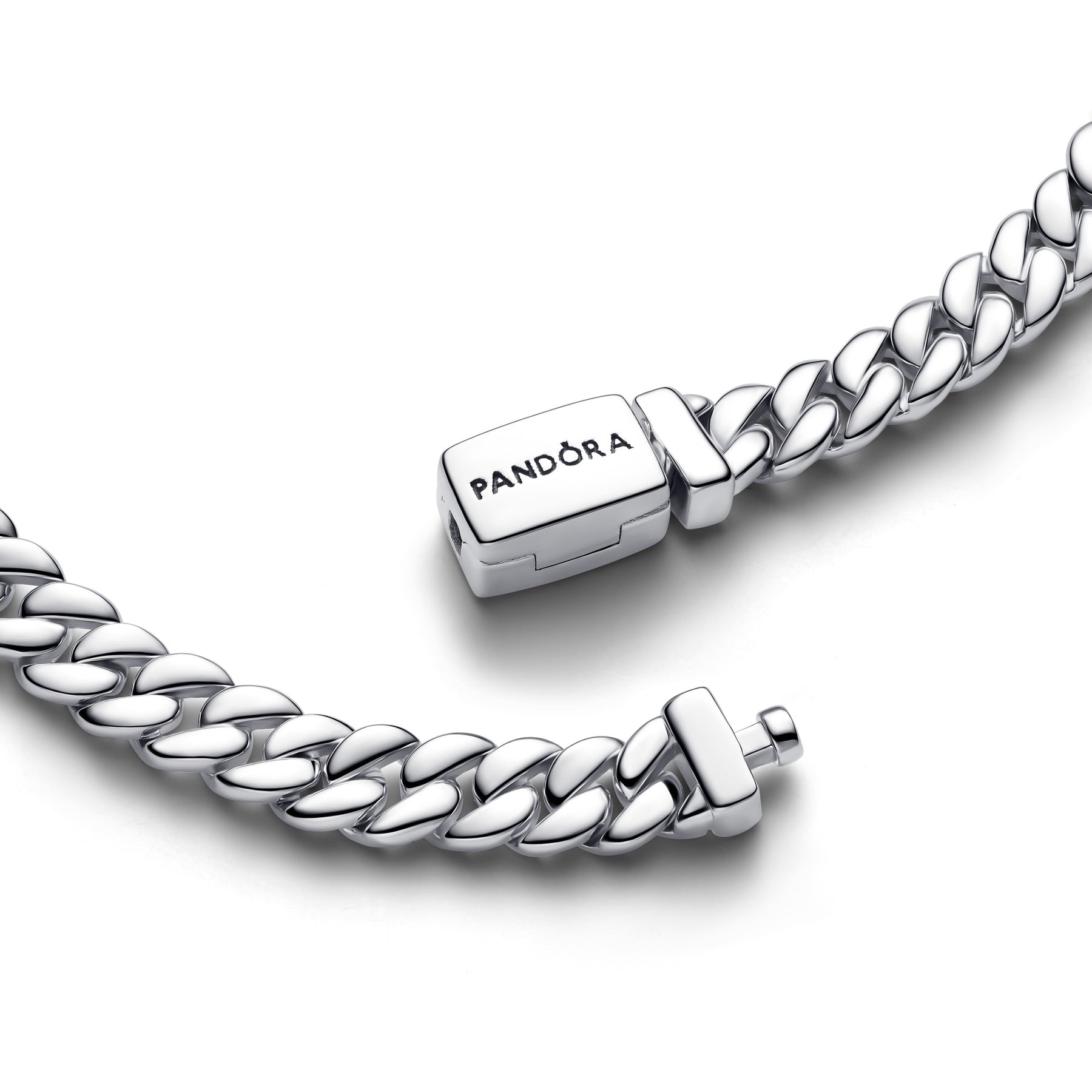 Elevate your look with this Cuban chain bracelet. Crafted in sterling silver or 14k gold plating, both sides are polished for a high-shine finish. It closes with a flat clasp, embossed with the PANDORA logo.