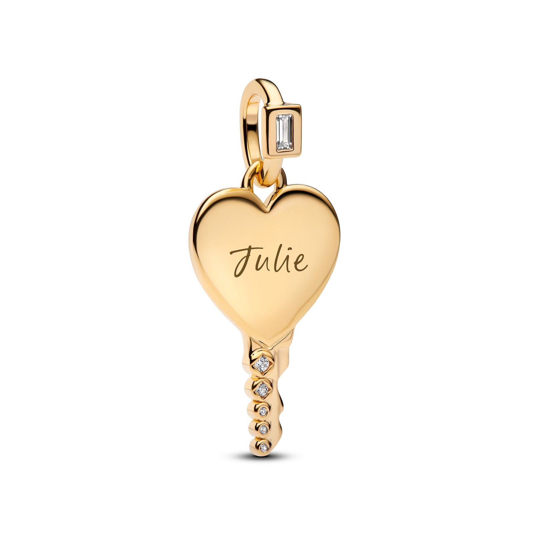 Unlock your story. This 14 gold-plated or sterling silver key pendant features an engravable heart-shaped head, a detailed blade with sparkling cubic zirconia, and a stone-accented bail.