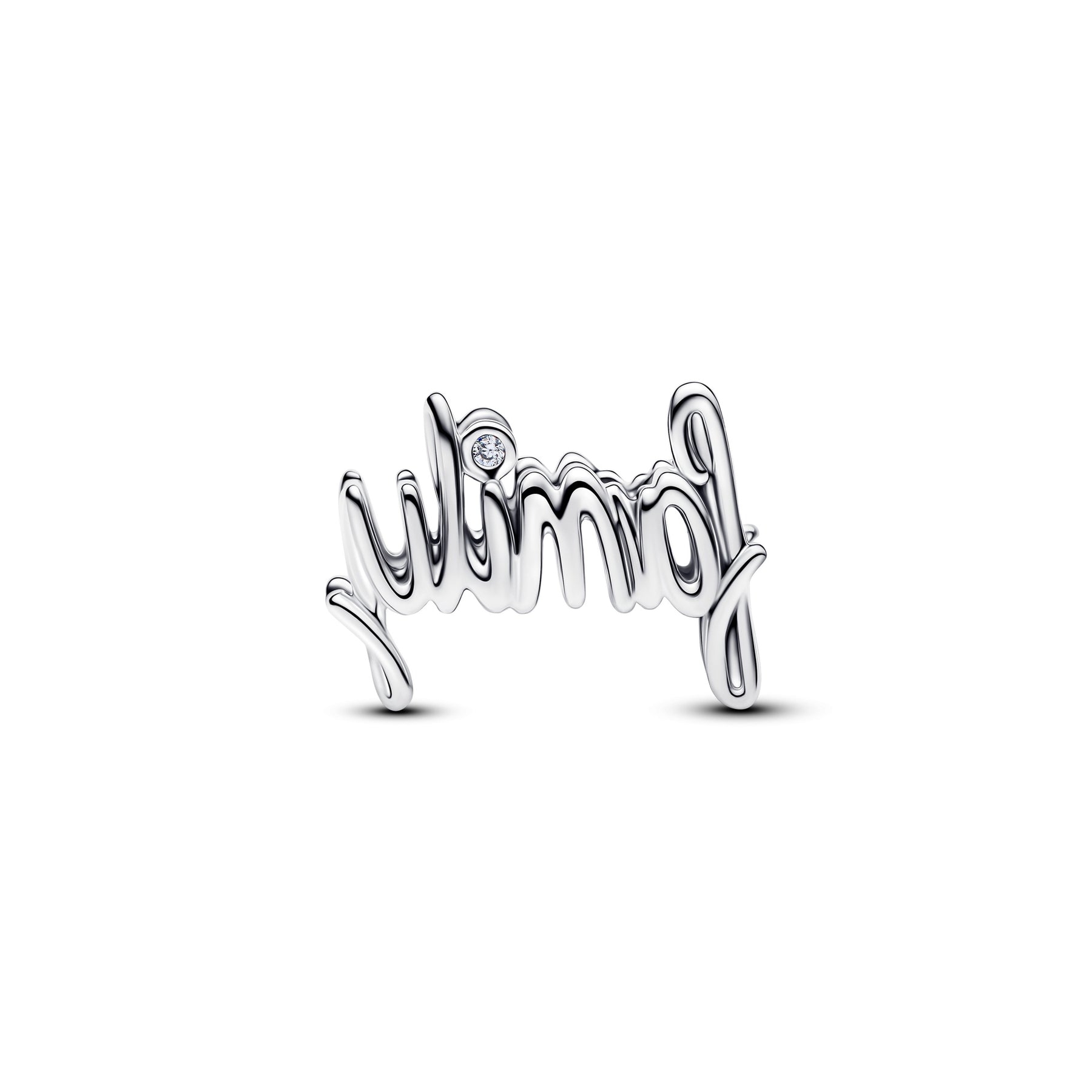 A shining reminder of what matters most. This sterling silver charm features a handwritten 'family' script with a cubic zirconia dot over the ‘i'. Expertly crafted, it’s a timeless tribute to the heart of every story.