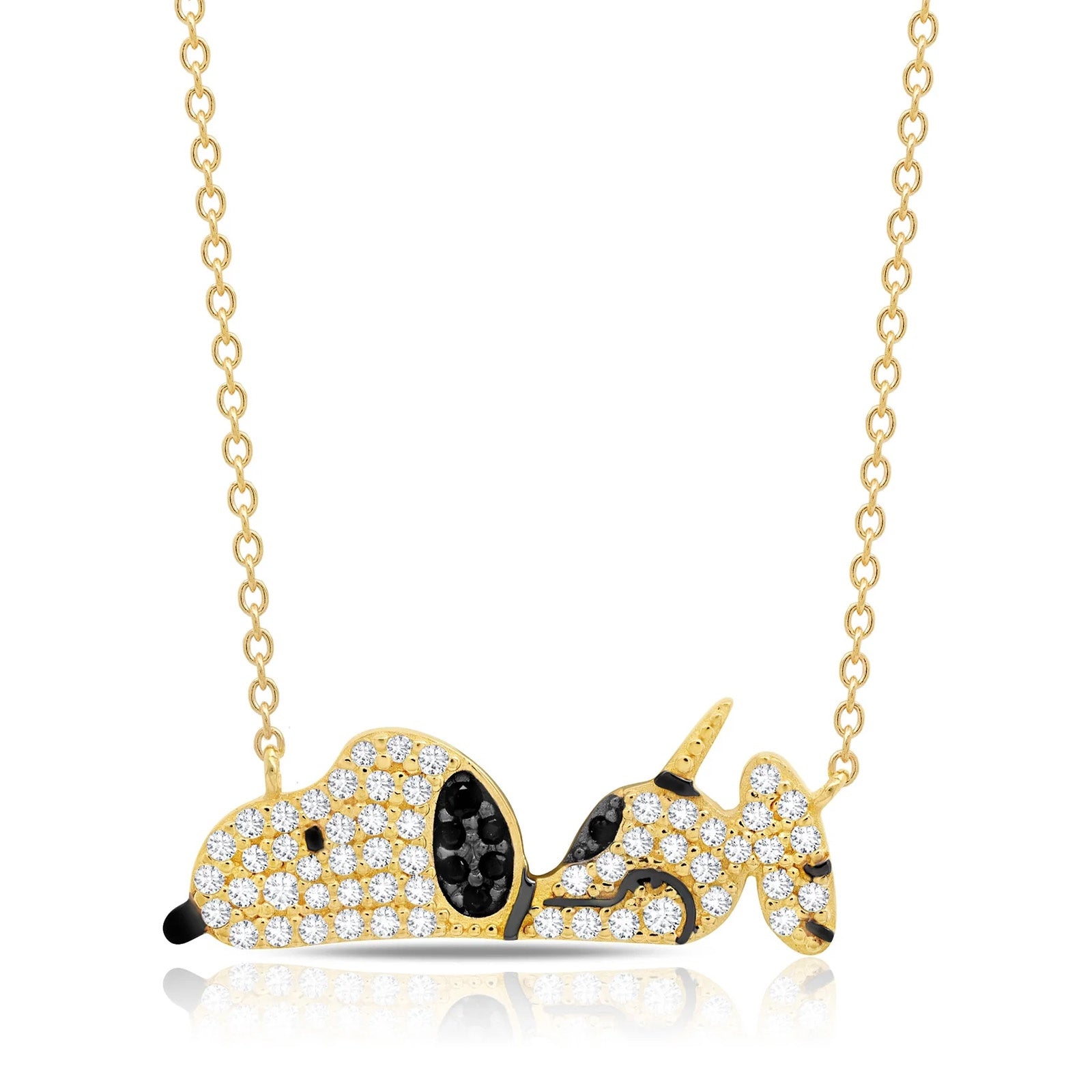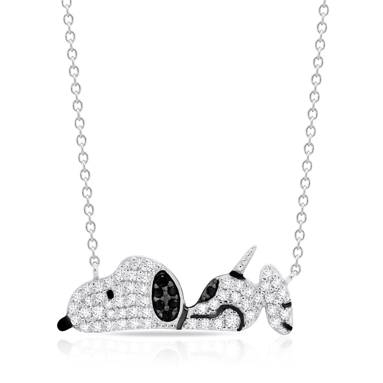 This Snoopy laying down pendant necklace features a fully pavé Snoopy silhouette with black enamel detailing for a total weight of 0.30 carats. This has 16" necklace with two 1" extenders the necklace is crafted in .925 sterling silver finished in pure platinum or 18k yellow gold, with flawless handset cubic zirconia. CRISLU jewelry is 100% hypoallergenic.