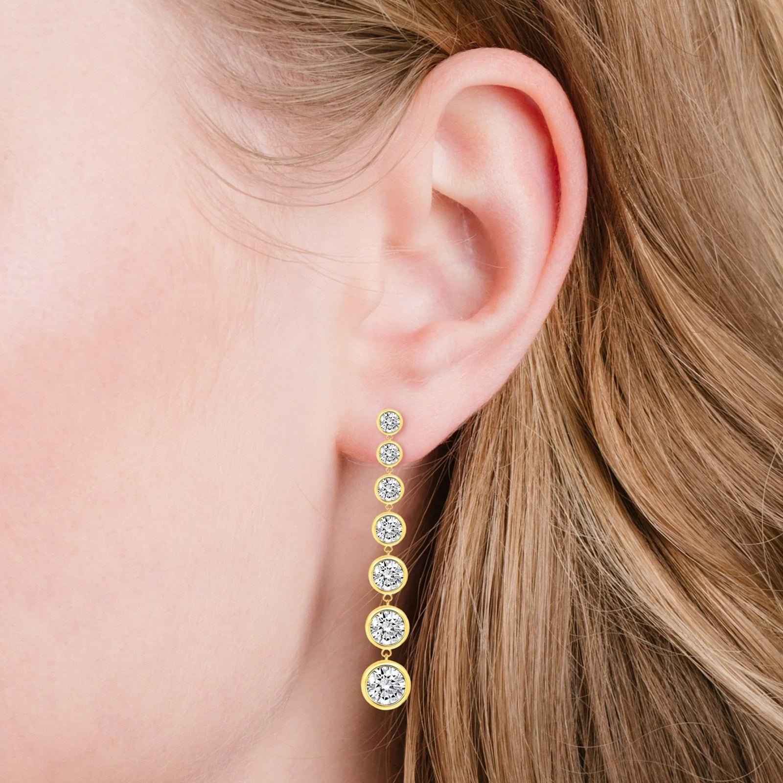 These drop earrings feature 8 mm bezel-set round brilliant stones, for a total weight of 2.70 carats. These earrings are crafted in .925 sterling silver finished in 18kt yellow gold, with flawless handset cubic zirconia. CRISLU jewelry is 100% hypoallergenic.