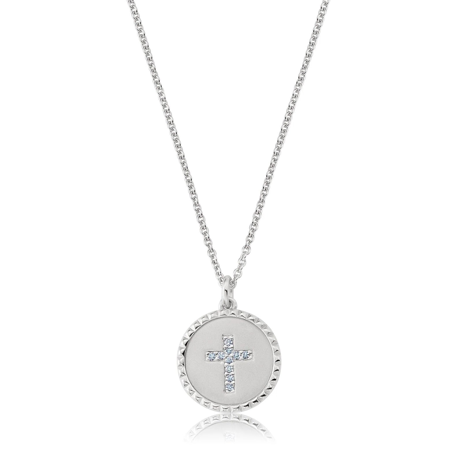This elegant pendant necklace features a small cross medallion design, for a total carat weight of 0.10. This necklace is crafted in .925 sterling silver finished in pure platinum or 18k gold, with flawless handset cubic zirconia, on a chain that extends from 16" to 17" and 18". CRISLU jewelry is 100% hypoallergenic.