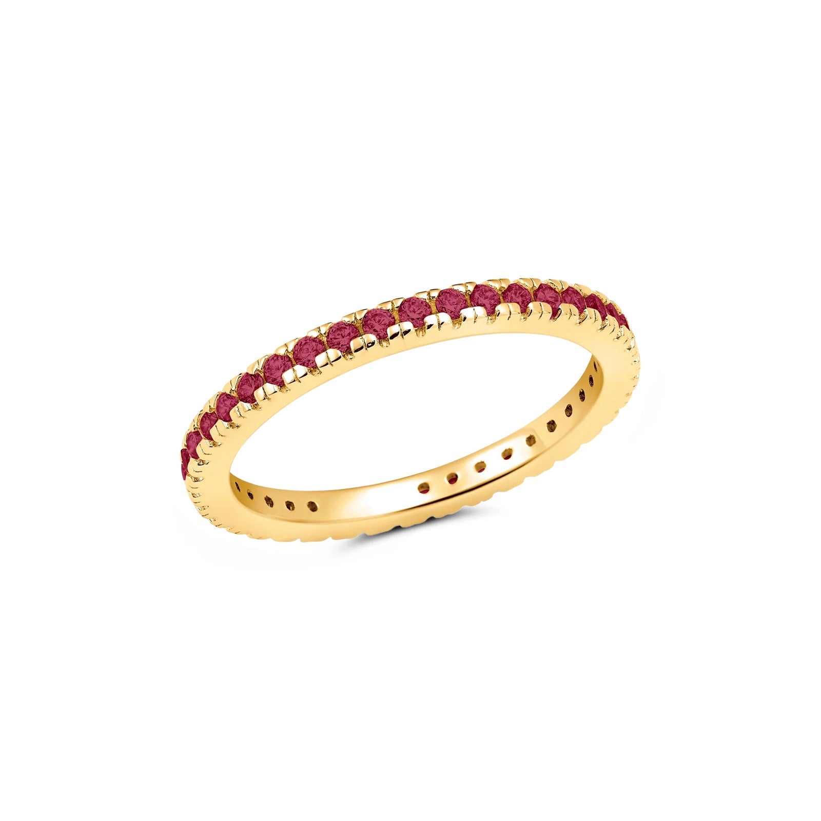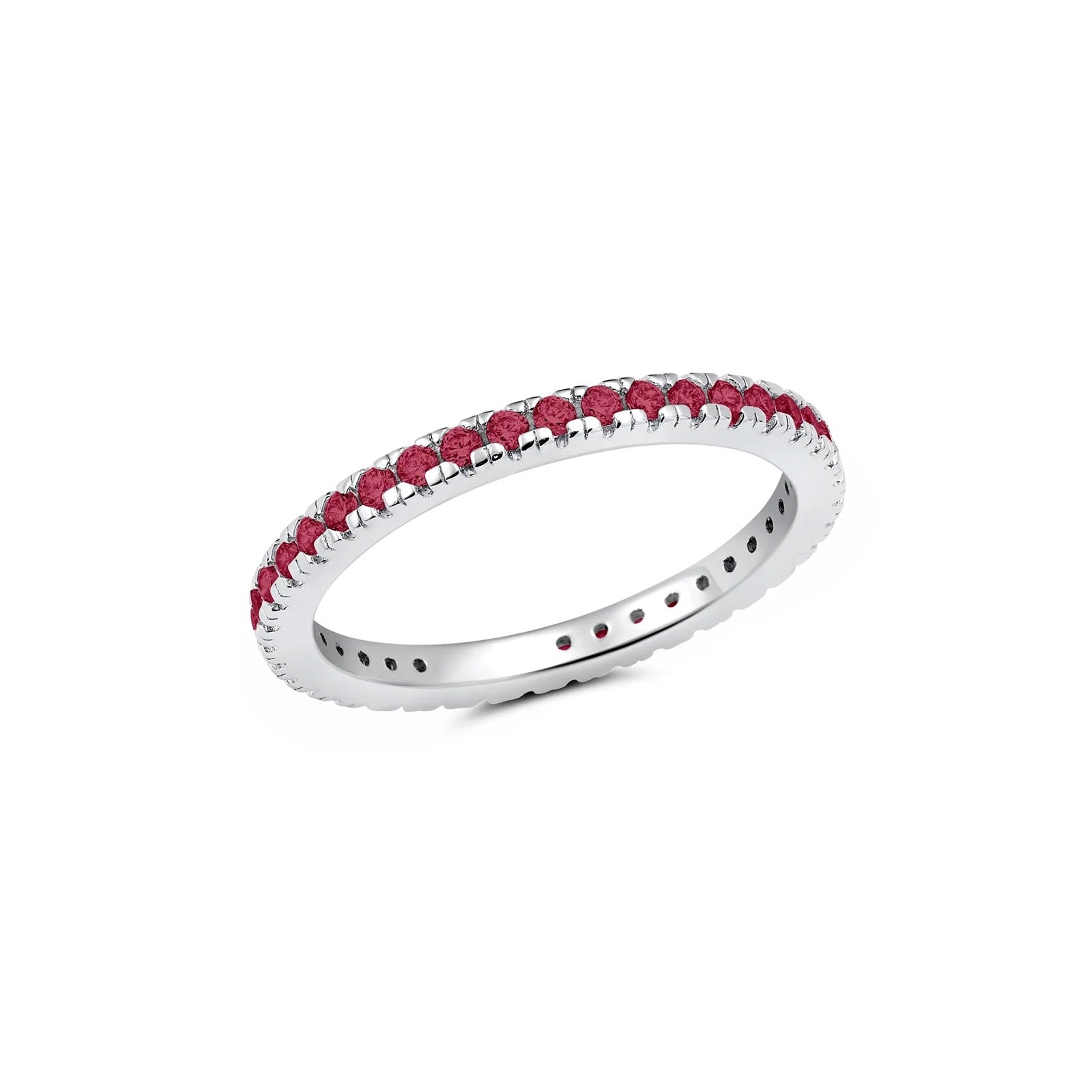 This radiant eternity band is 2.8 mm wide and features brilliant-cut July birthstones, for a total weight of 0.6 carats. This ring is crafted in .925 sterling silver finished in 18k yellow gold or pure platinum, with flawless handset cubic zirconia. CRISLU jewelry is 100% hypoallergenic.