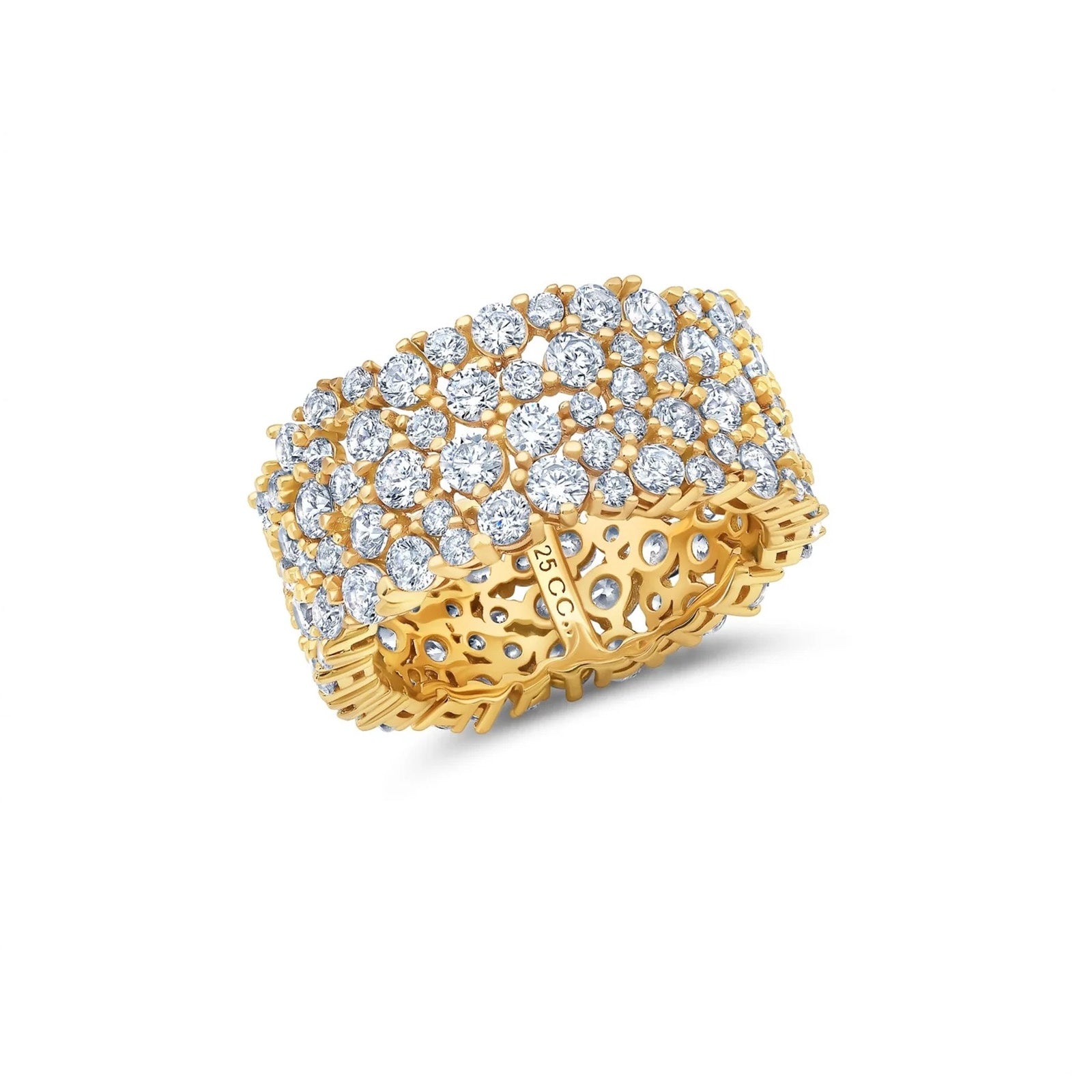 This ring features a dazzling cluster design of brilliant-cut stones for a total weight of 4.25 carats. Crafted in .925 sterling silver and finished in 18kt yellow gold, with flawless handset cubic zirconia. CRISLU jewelry is 100% hypoallergenic.