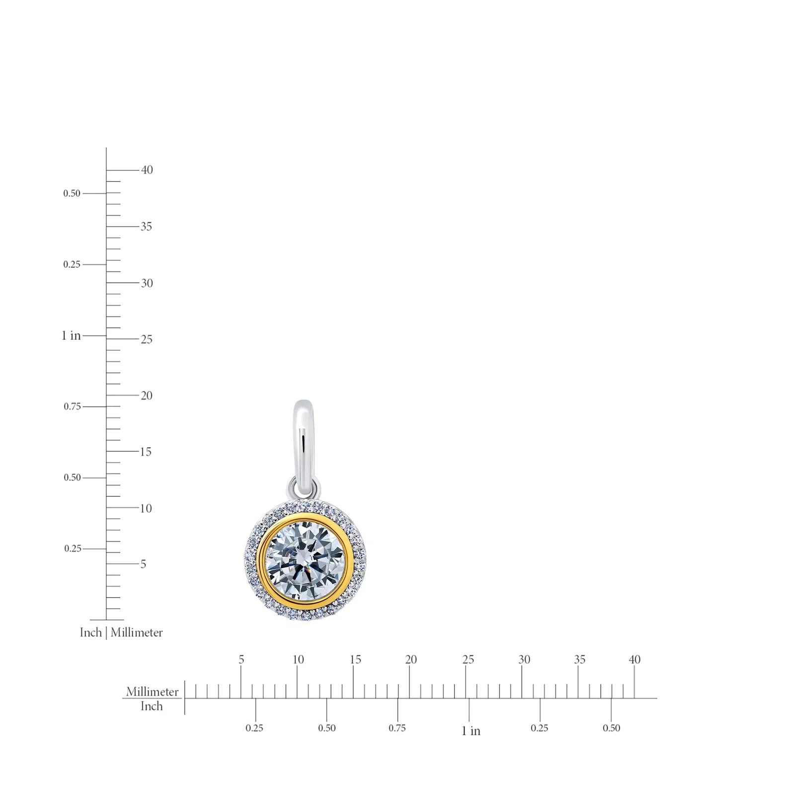 This two tone charm features bezel set cubic zirconia, surrounded by a halo of gold and pave cz, for a total carat weight of 1.40. It fits on 2mm necklaces, anklets, and bracelets. This charm is crafted in .925 sterling silver finished in pure platinum and 18kt yellow gold, with flawless handset cubic zirconia. CRISLU jewelry is 100% hypoallergenic