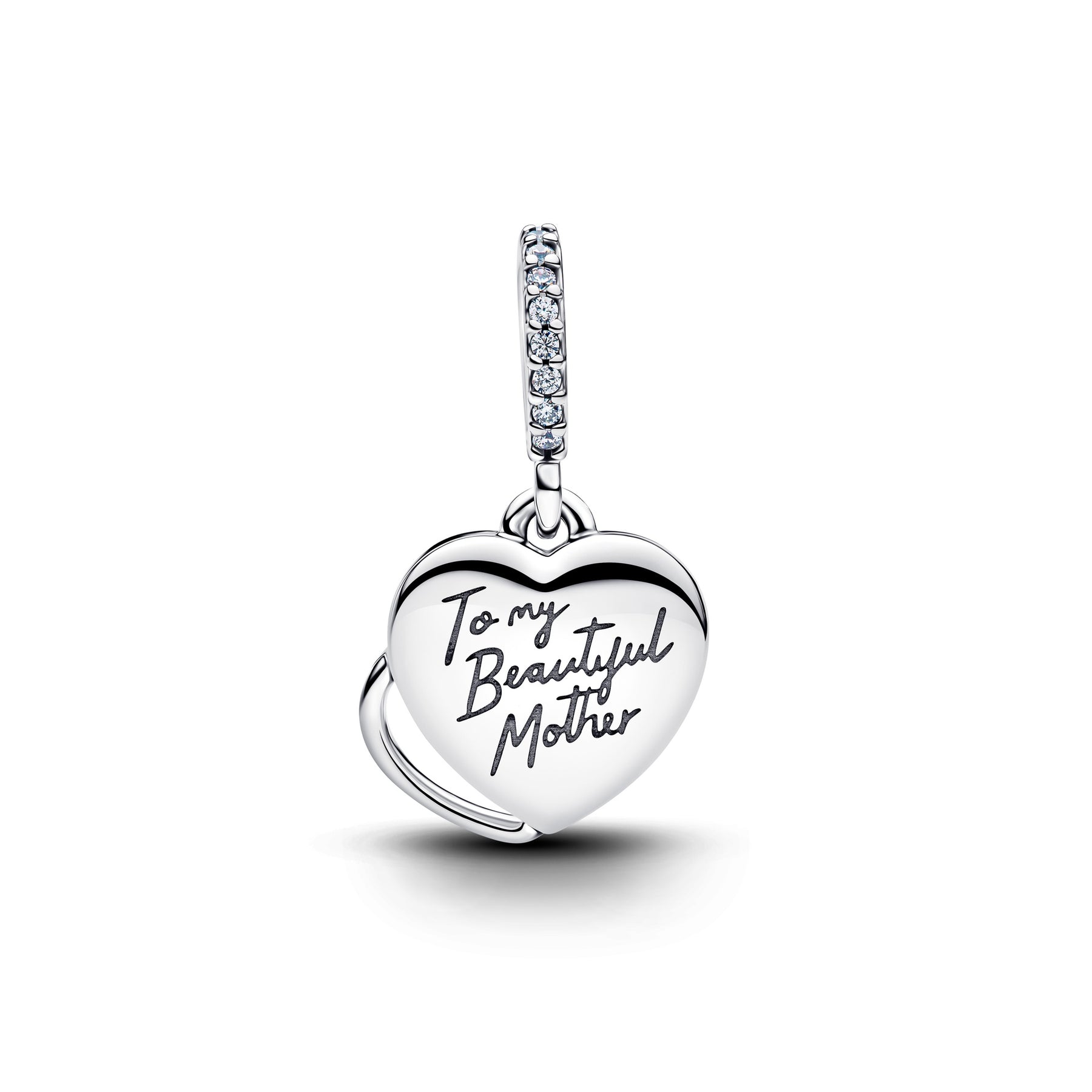 Crafted in sterling silver, this charm features two heart-shaped dangles. One has a sparkling mosaic effect and a cut-out heart. The other features a lab-created opal and the engraving 'To my Beautiful Mother'.