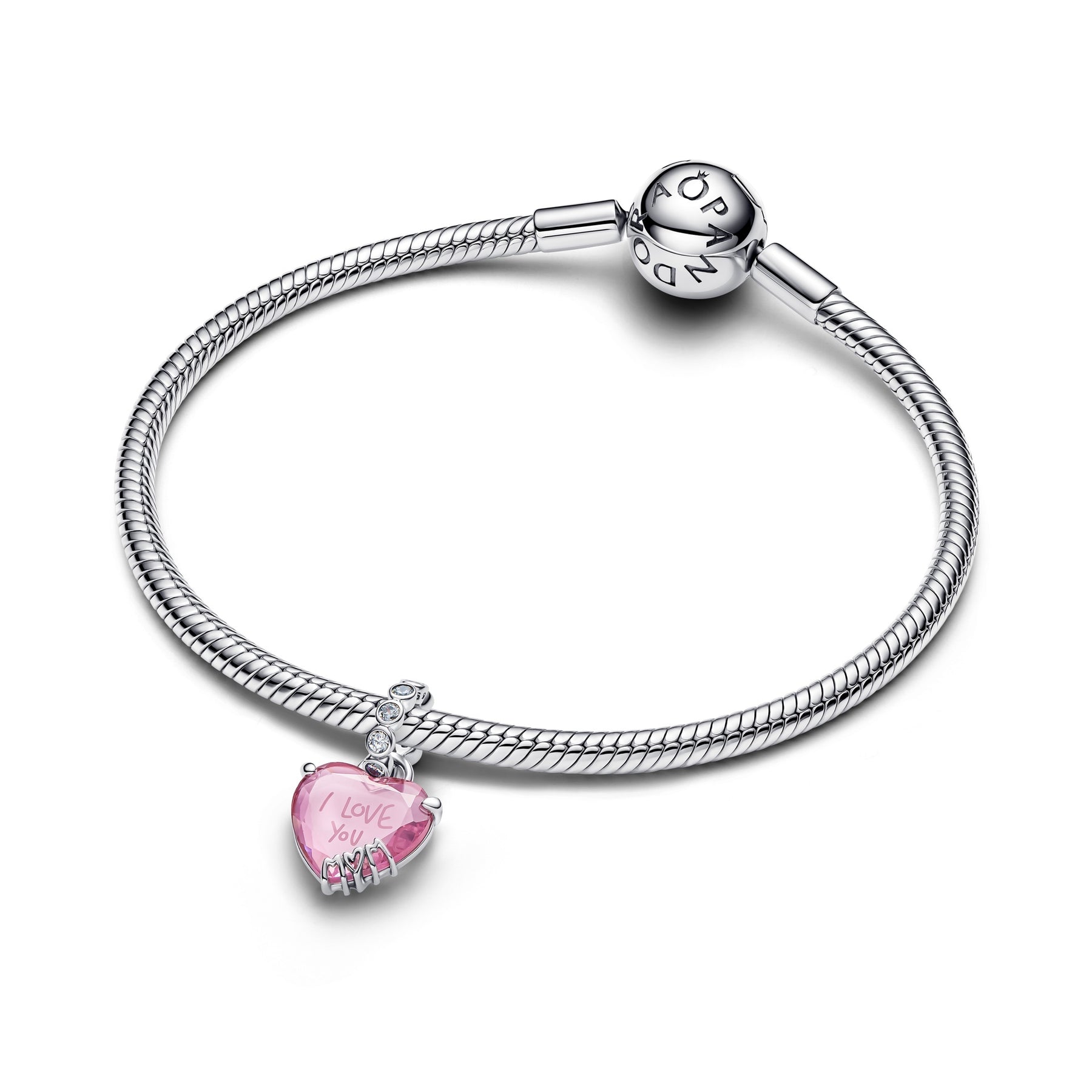 Say it all this Mother's Day with our engraved heart dangle charm. A heart-shaped pink stone is set in sterling silver with the word 'MOM' scripted into the setting. The heart itself features the message 'I LOVE YOU'.