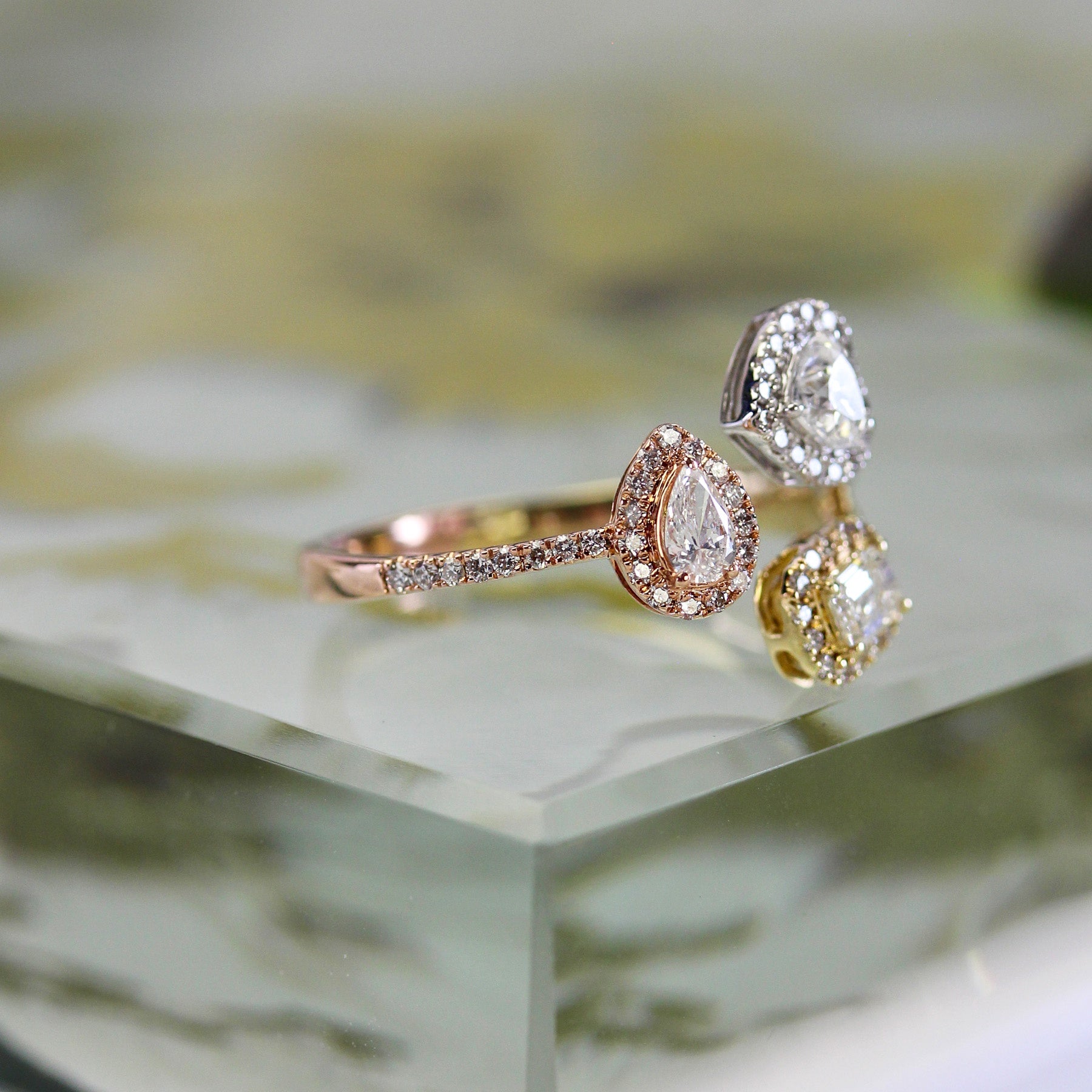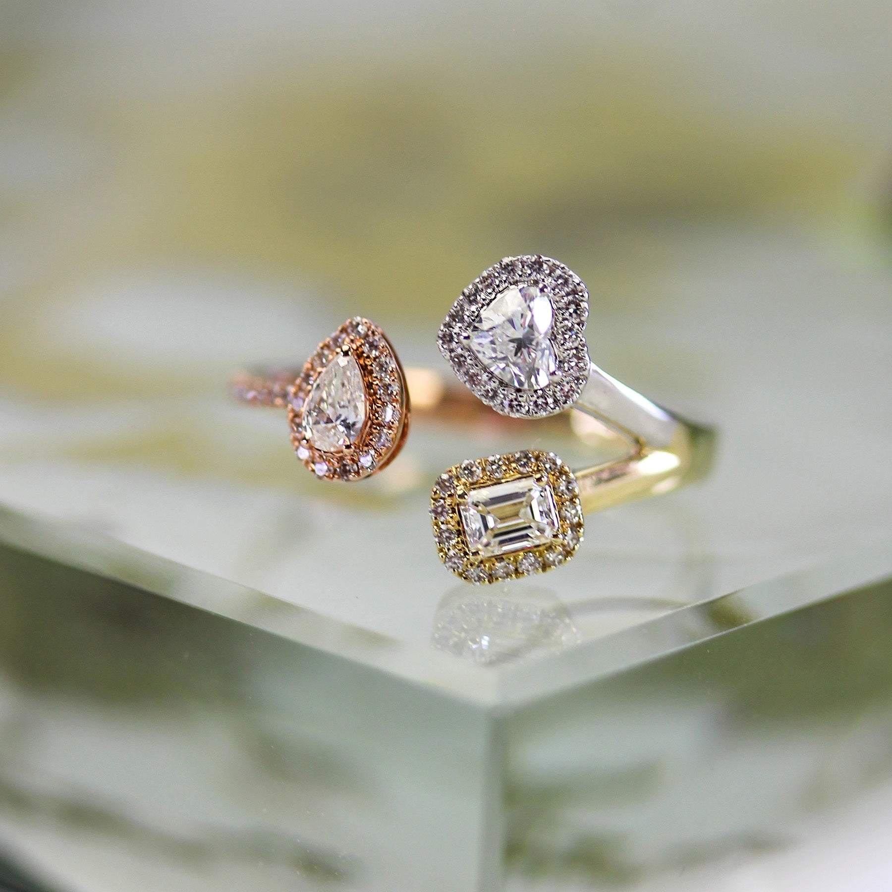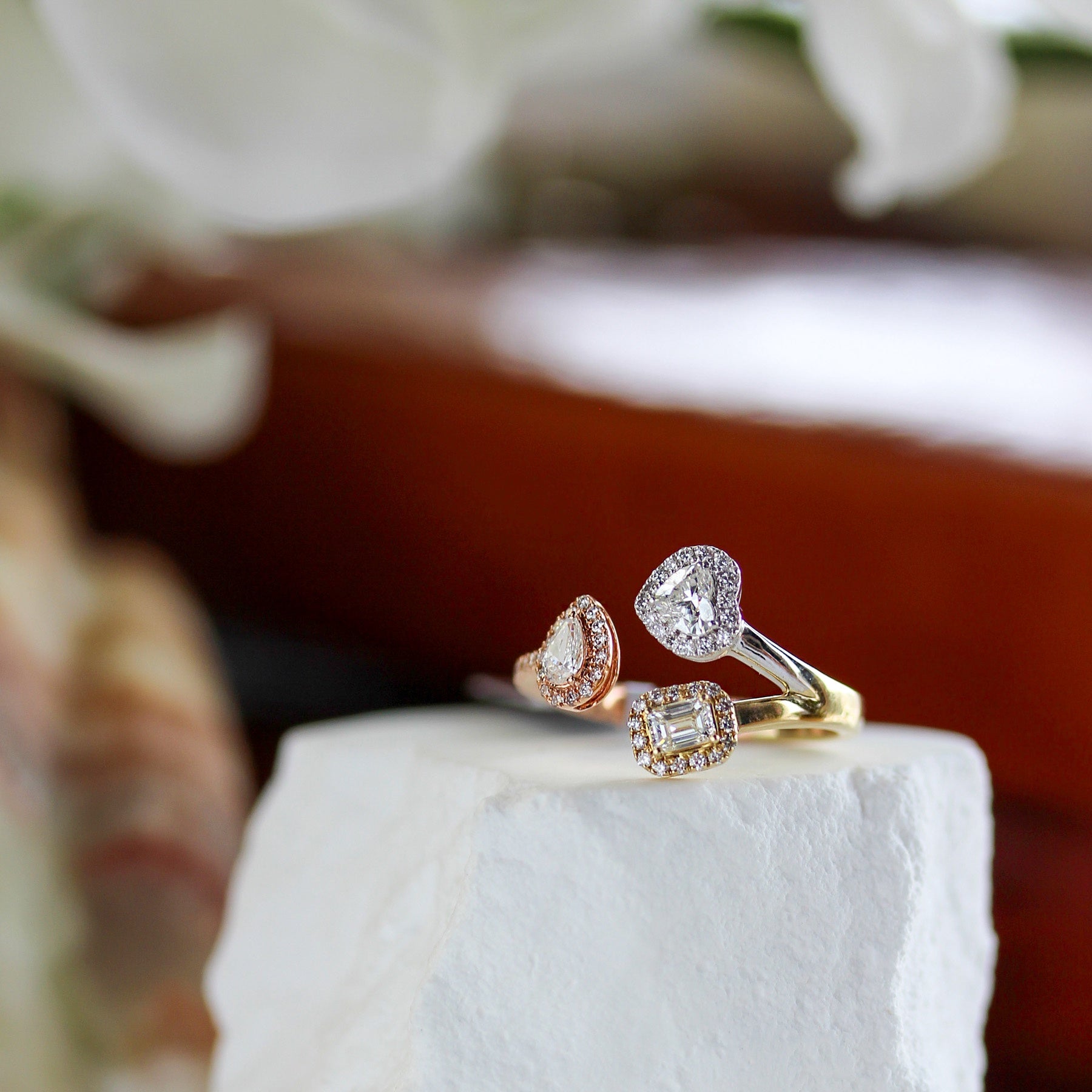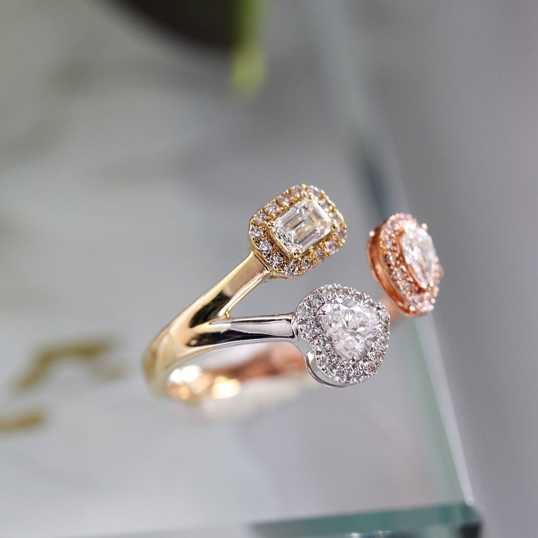 A bold celebration of shape, sparkle, and craftsmanship. This 14KT tri-color gold ring showcases a stunning combination of round, emerald-cut, heart-shaped, and pear-shaped diamonds, each framed in delicate diamond halos. The open bypass design allows each shape to shine individually while coming together in one cohesive, eye-catching statement.