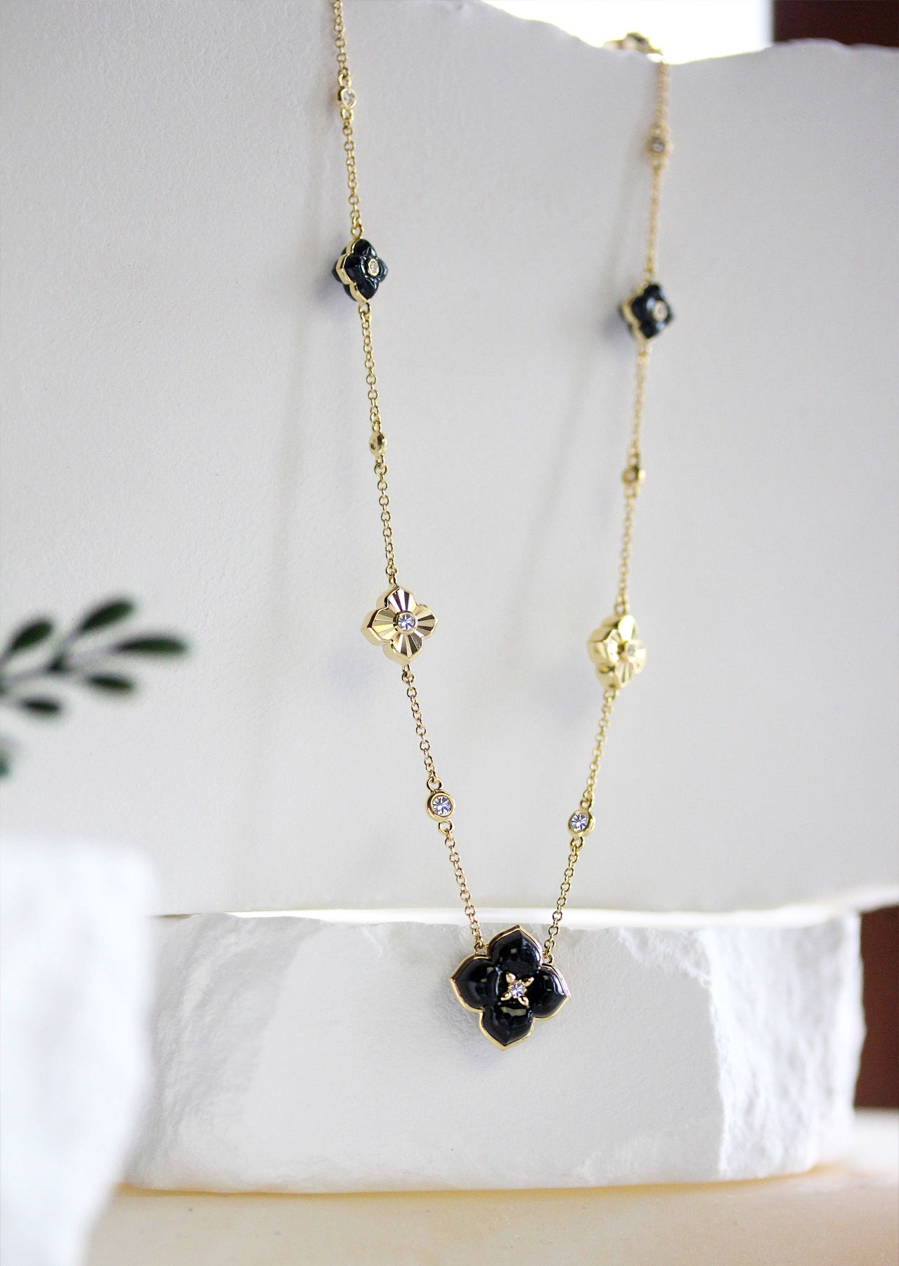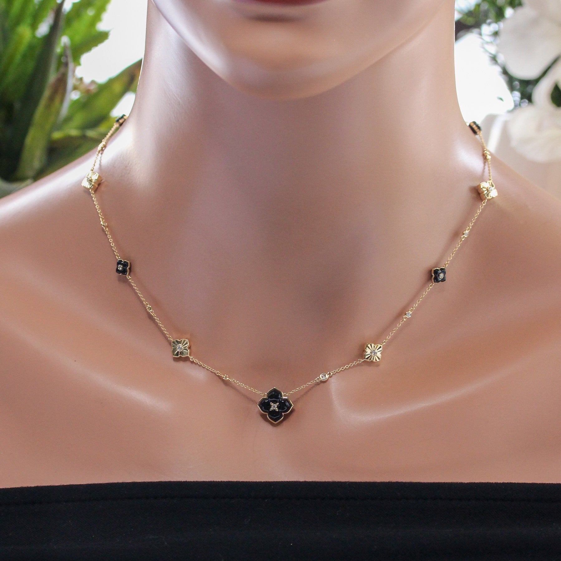Bold yet refined, this 14K yellow gold station necklace features alternating diamond and black onyx clover motifs for striking contrast and timeless elegance. With 0.50 carats of shimmering diamonds, the piece offers just the right balance of sparkle and sophistication.
