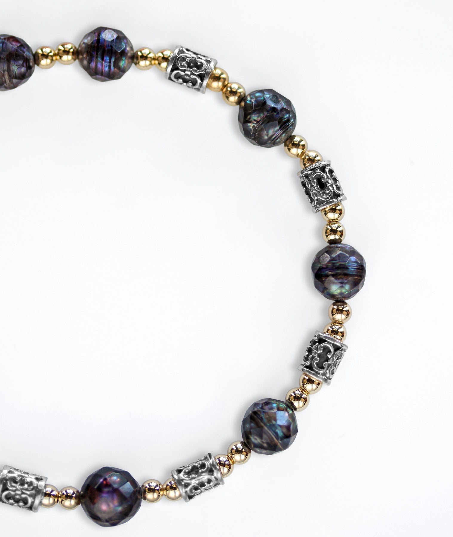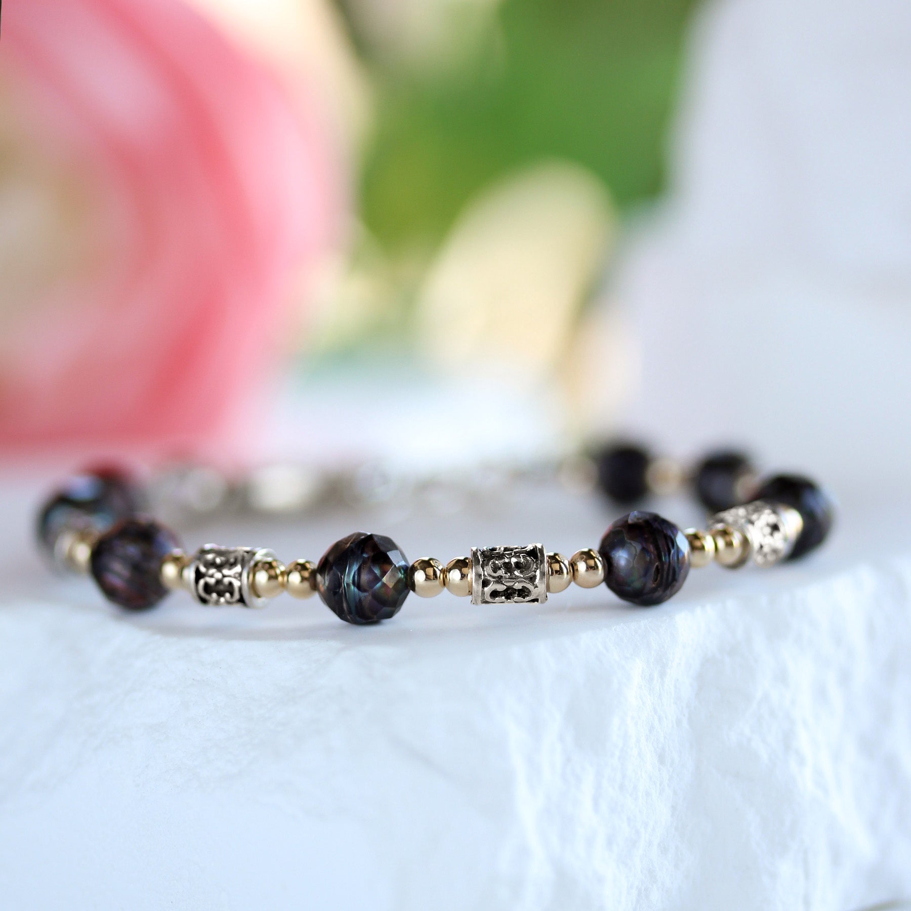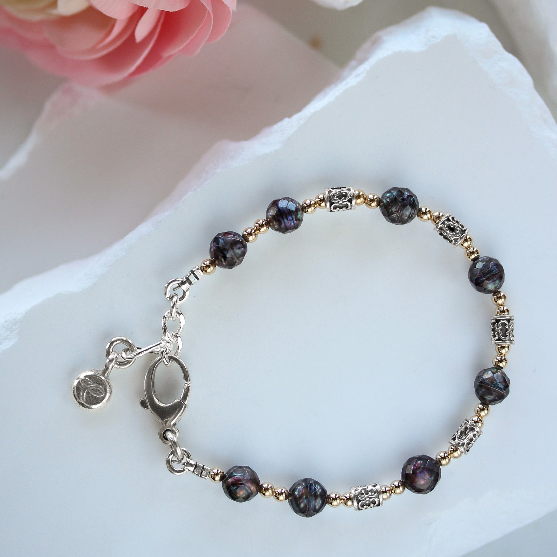 The combination of organic pearl shimmer and detailed metalwork gives this piece depth and character, while the secure clasp ensures comfortable everyday wear.