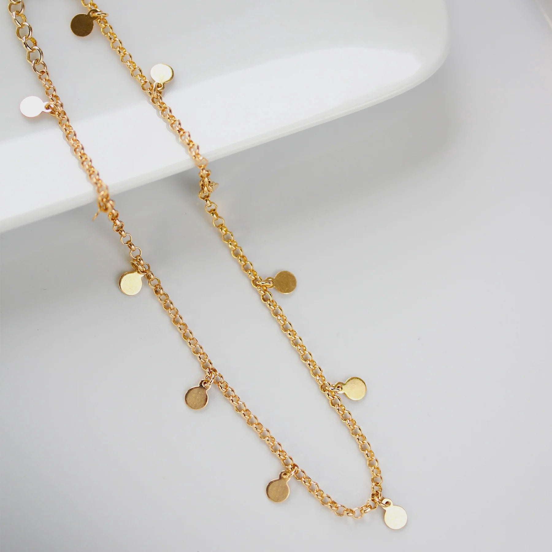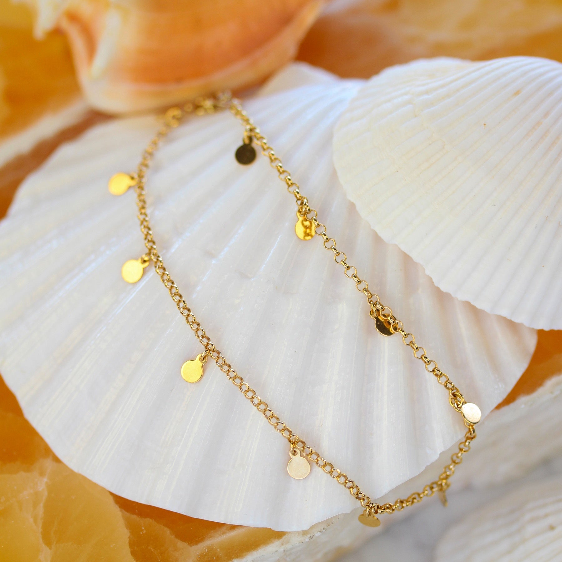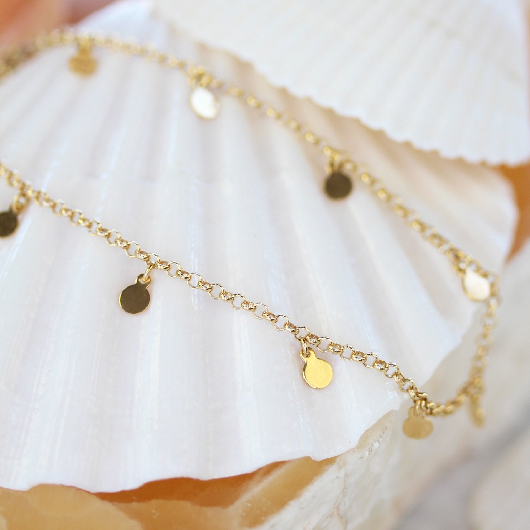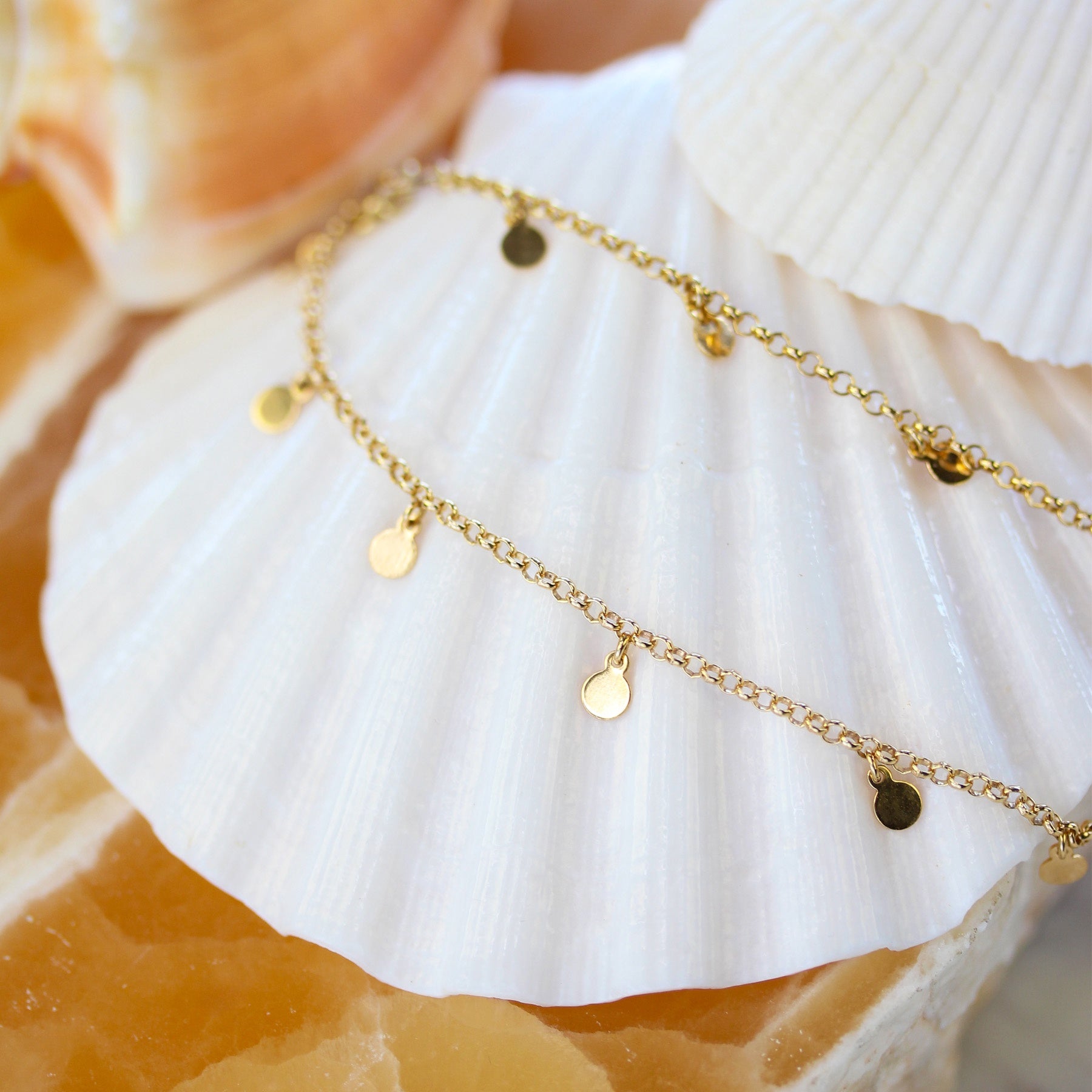 Radiant and full of movement, the Elani Anklet captures the glow of sunlit days. Crafted with a 14k gold-filled chain, this luminous design is accented with tiny golden discs that sway and shimmer with every step β€” like sunlight dancing across the water.