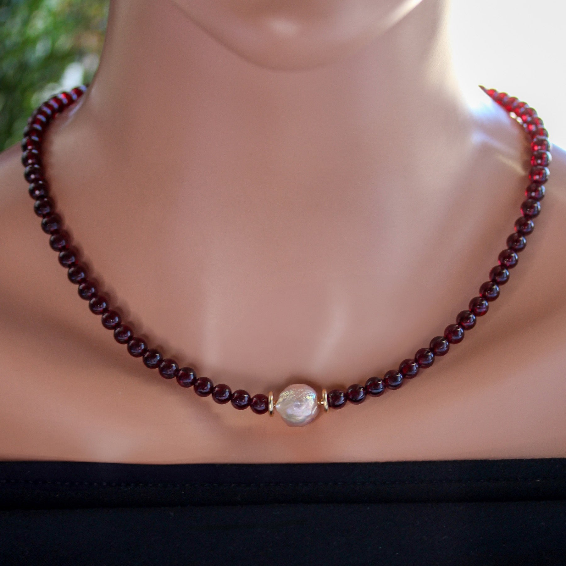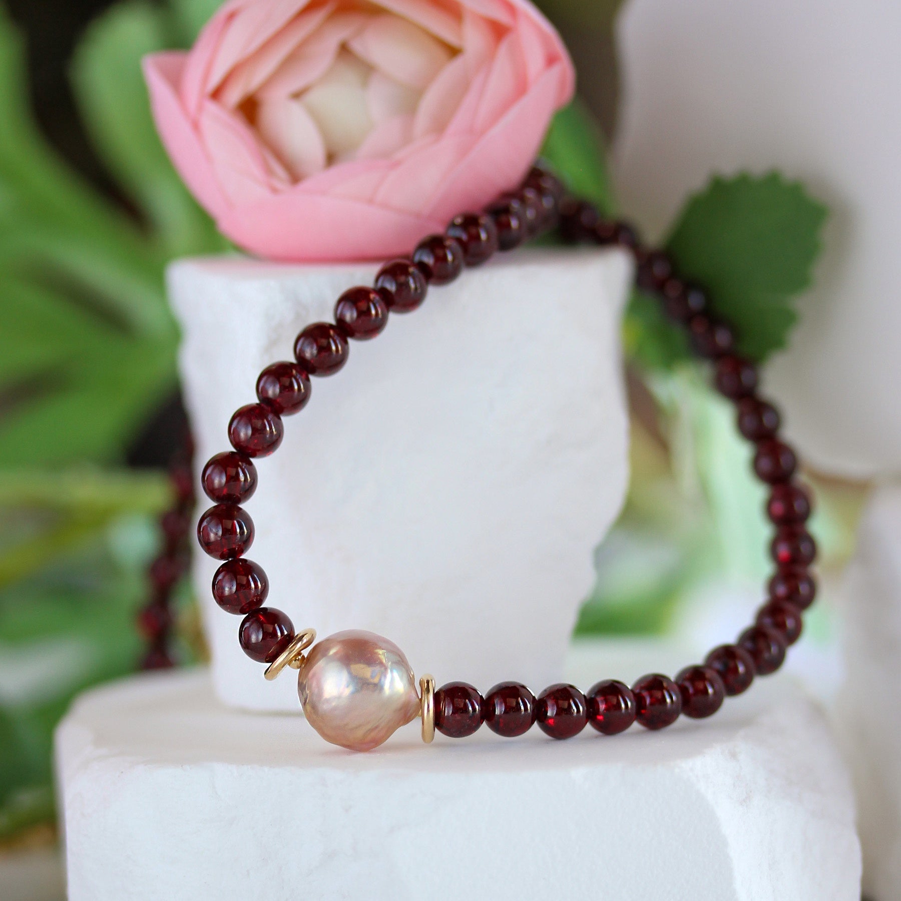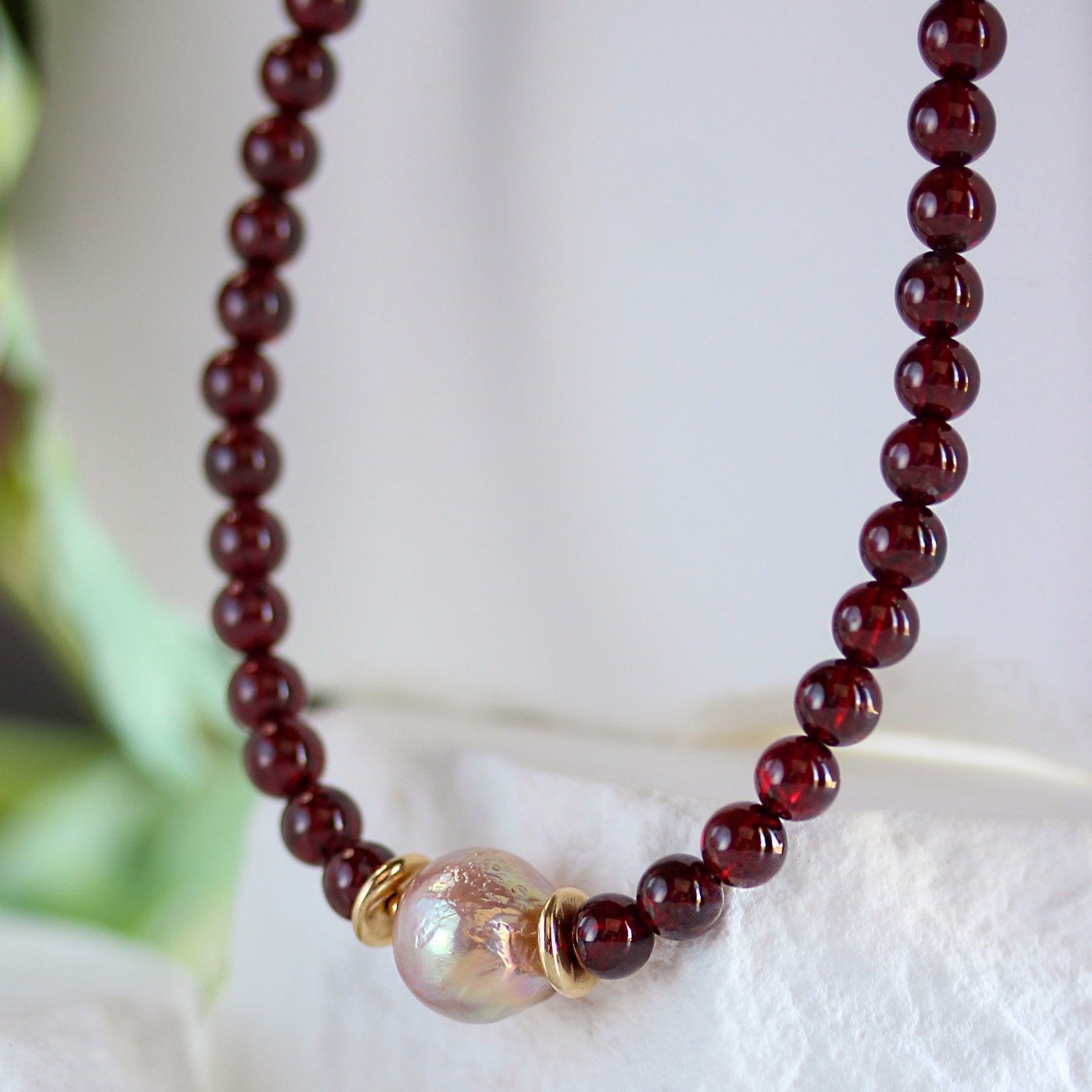 A strand of 6mm round garnet beads forms a deep wine-red silhouette, creating a bold yet timeless foundation. At the front, a radiant fireball pearl serves as the focal point — its organic shape and iridescent glow adding beautiful dimension and softness. Gold-tone accents frame the pearl, bringing warmth and balance to the design.