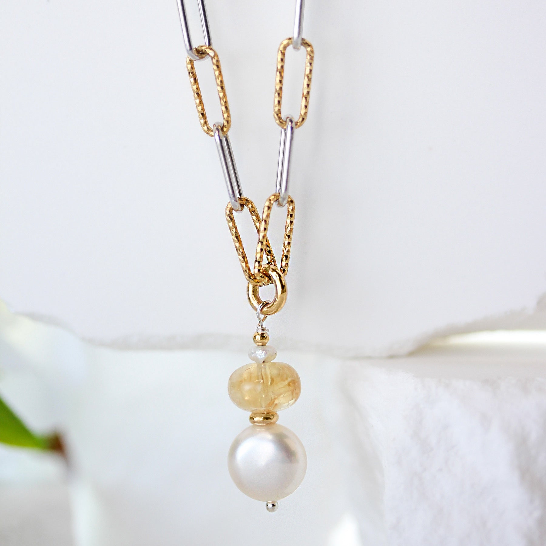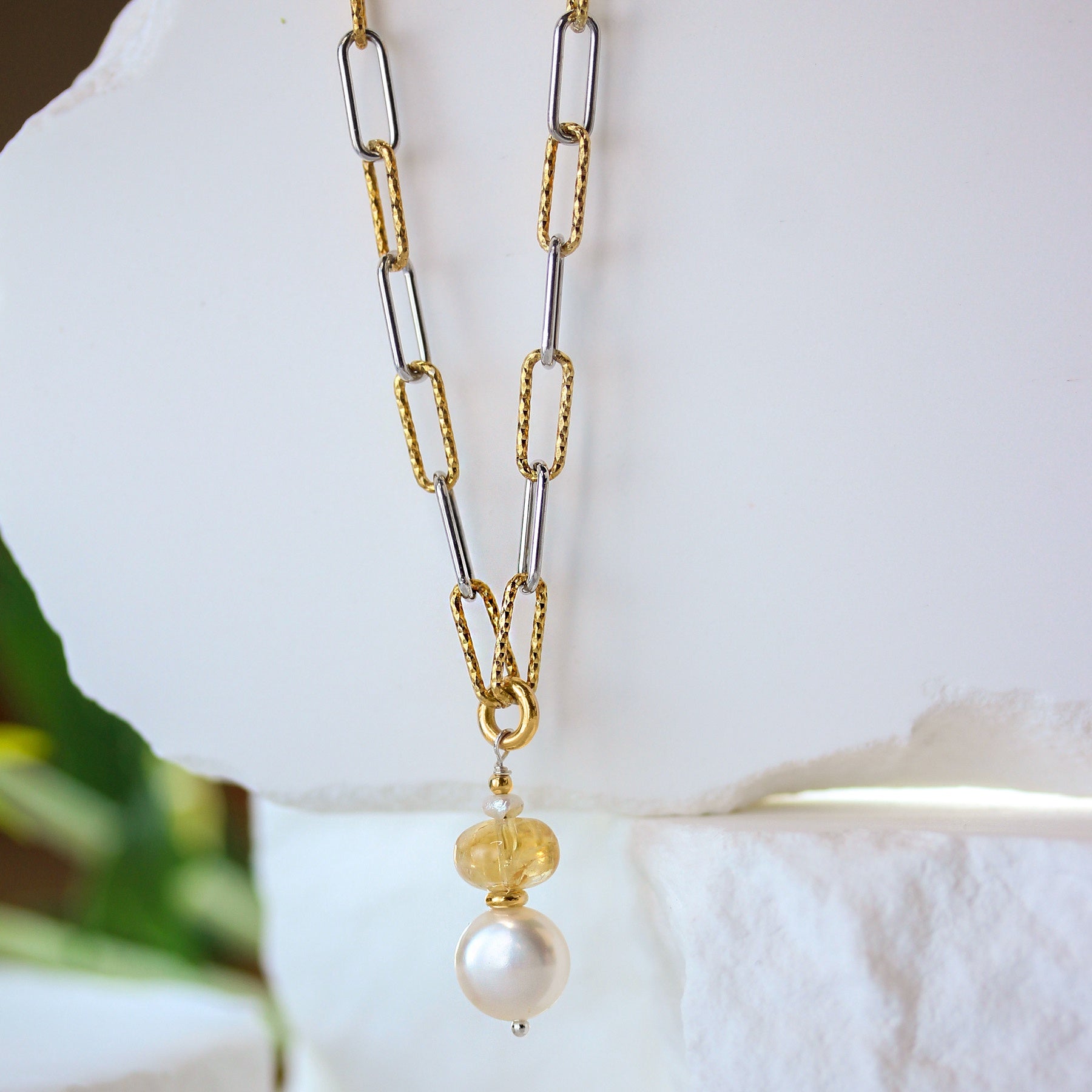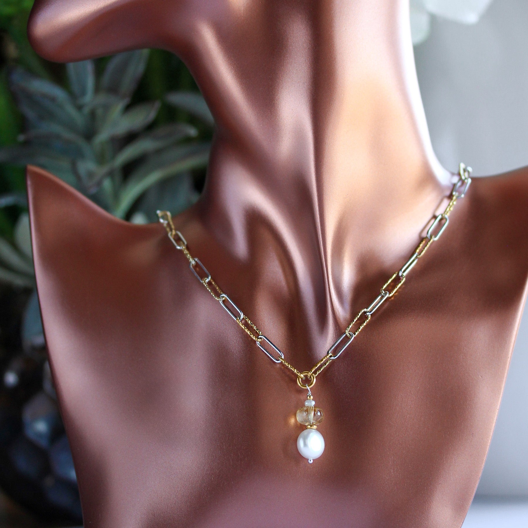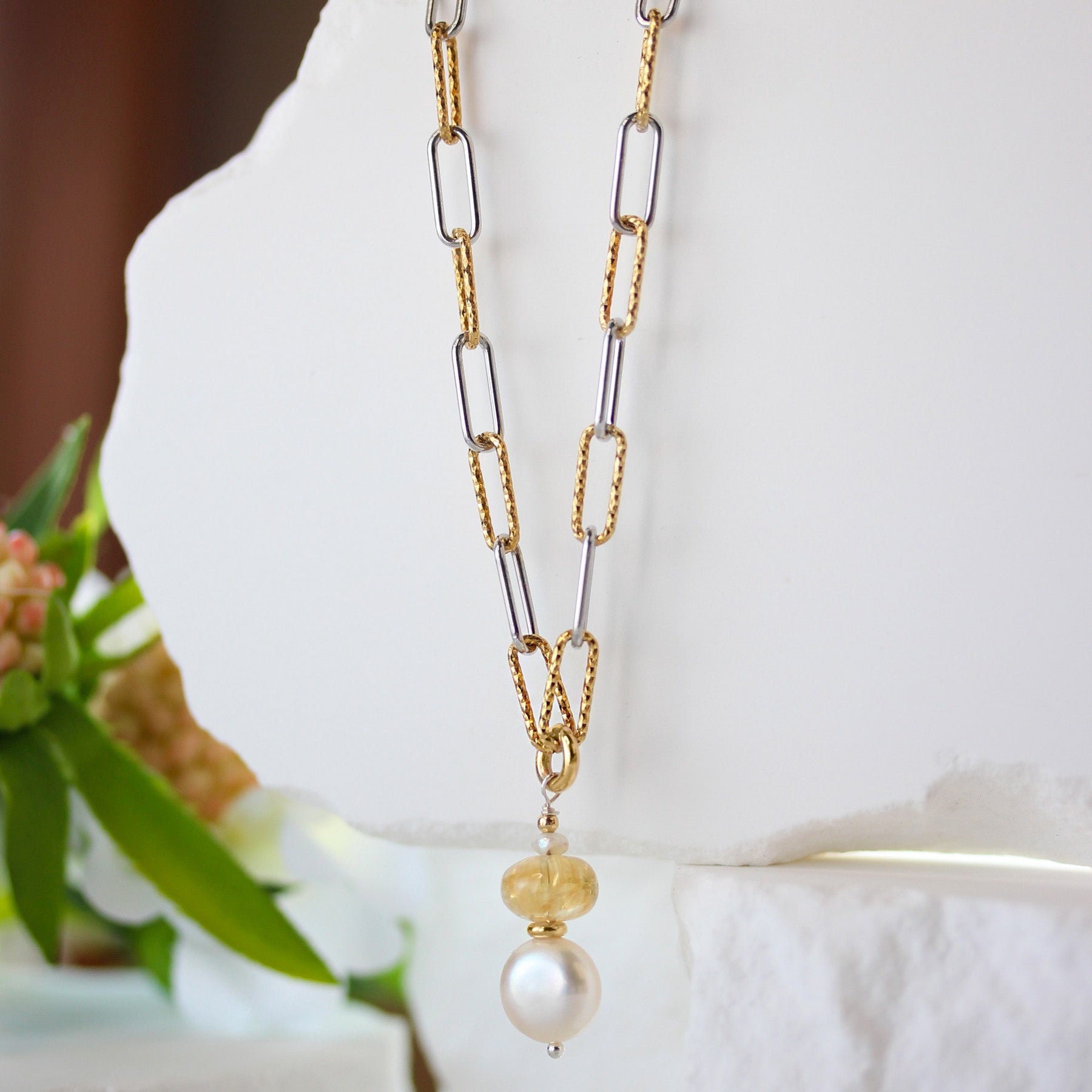 The contrast of rich topaz, creamy pearl, and mixed-metal chain makes this piece effortlessly versatile — polished enough for evening, yet elevated enough for everyday wear.
