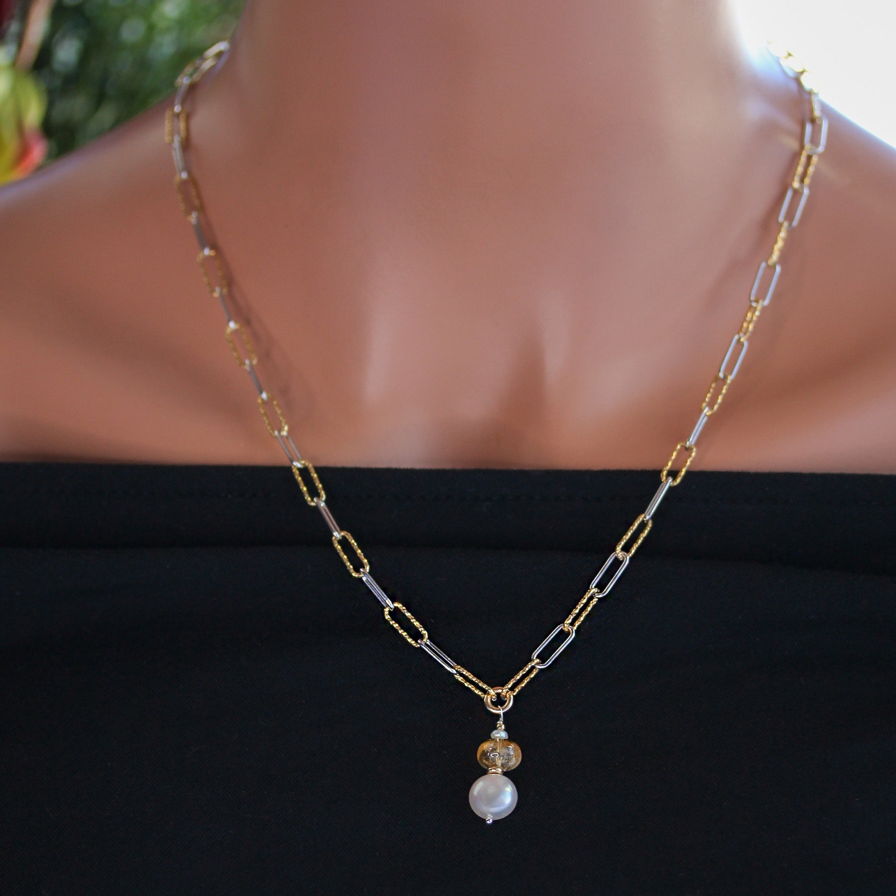 A luminous coin-shaped freshwater pearl drops gracefully beneath a glowing Imperial Topaz bead, creating a soft, refined focal point. The pendant is suspended from a modern two-tone paperclip chain, blending warm gold with cool sterling silver for a balanced, contemporary look.
