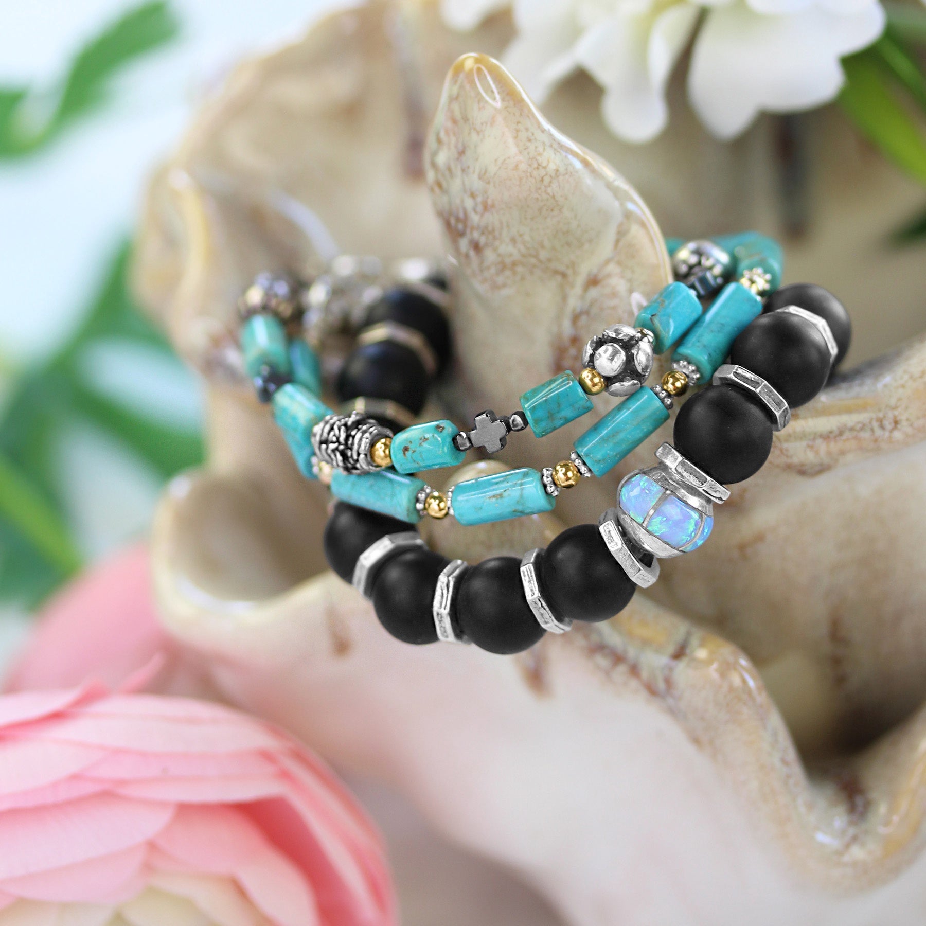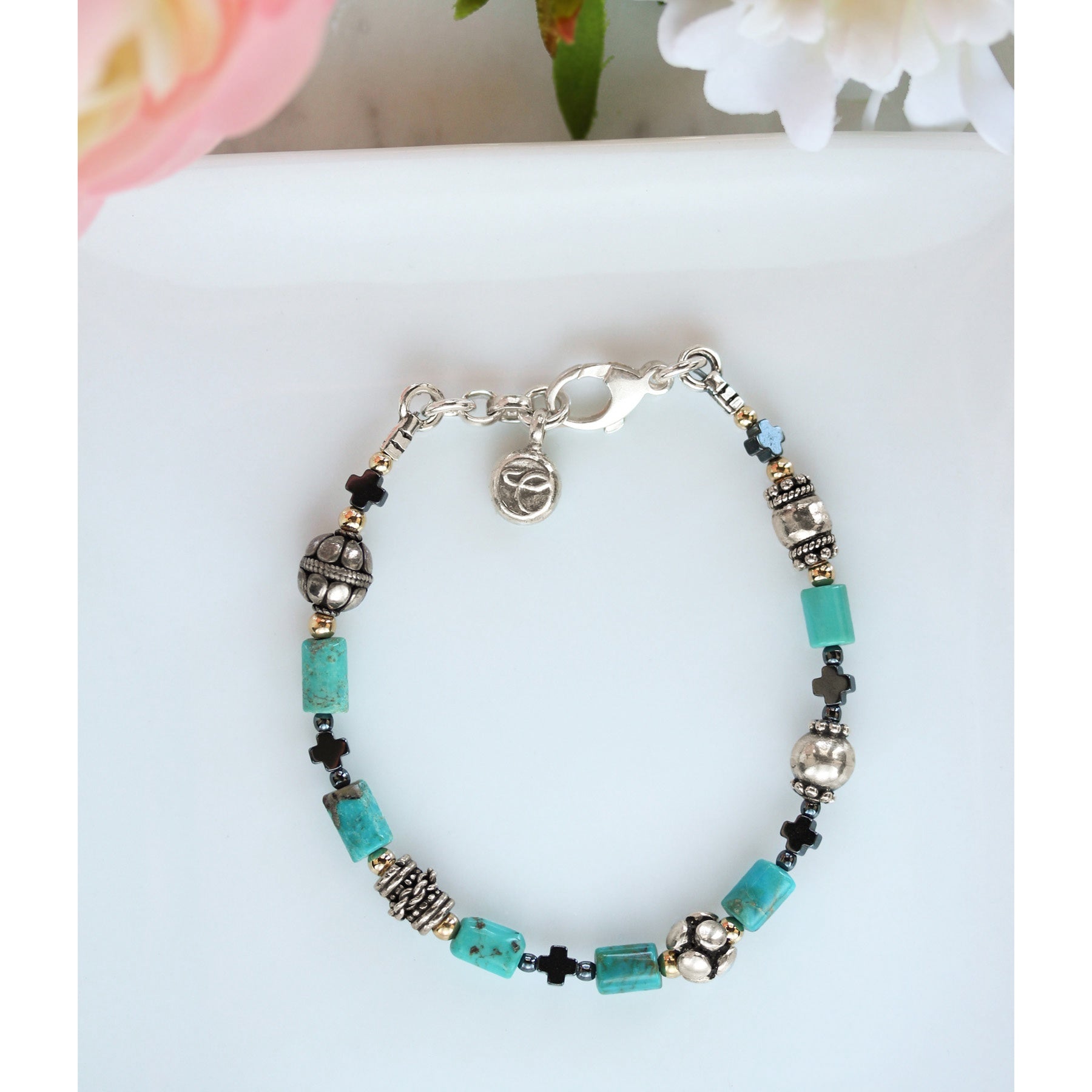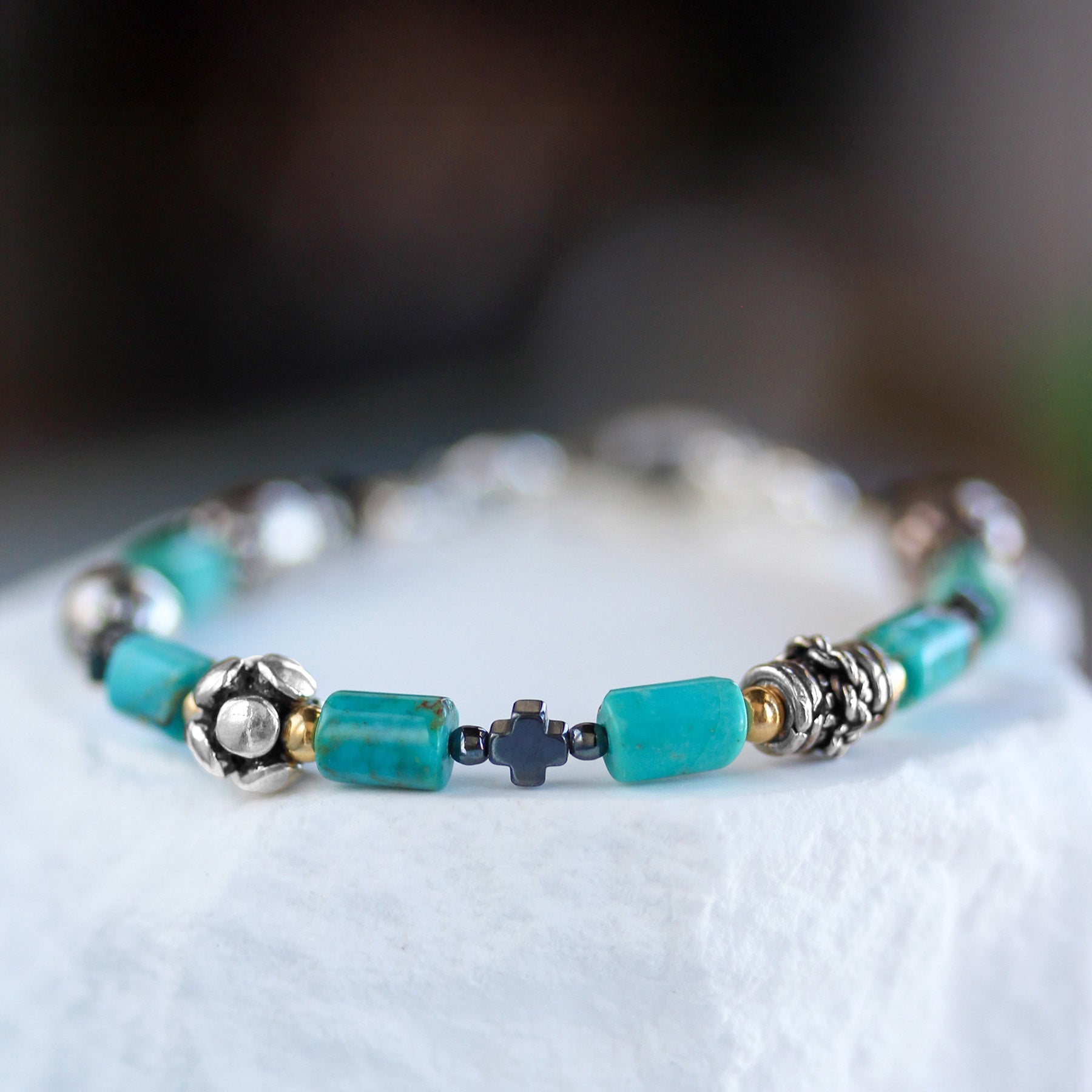 Vibrant tube-shaped turquoise is accented with hematite Maltese cross beads and detailed sterling silver elements in this distinctive bracelet. The combination of rich blue-green turquoise, deep metallic hematite, and handcrafted sterling silver, and gold accents creates a balanced design with both texture and meaning.