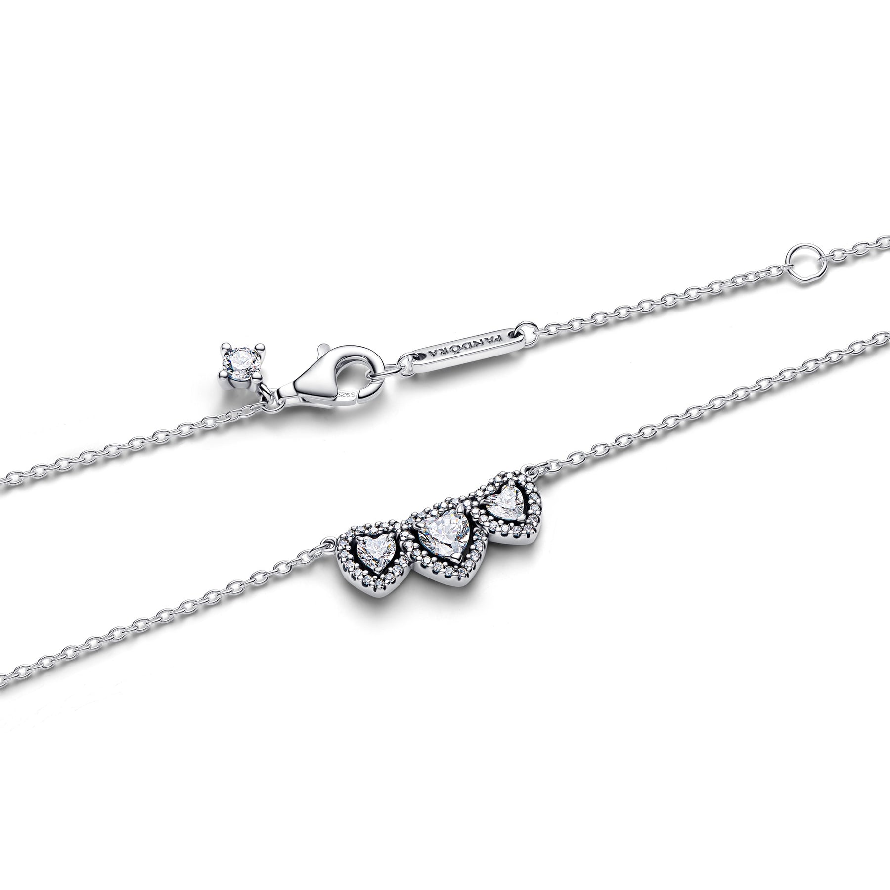 Shine with love. Our sterling silver collier features three heart-shaped cubic zirconia, framed in a radiant halo and joined in perfect harmony. With a fixed pendant and a delicate dangling stone near the clasp