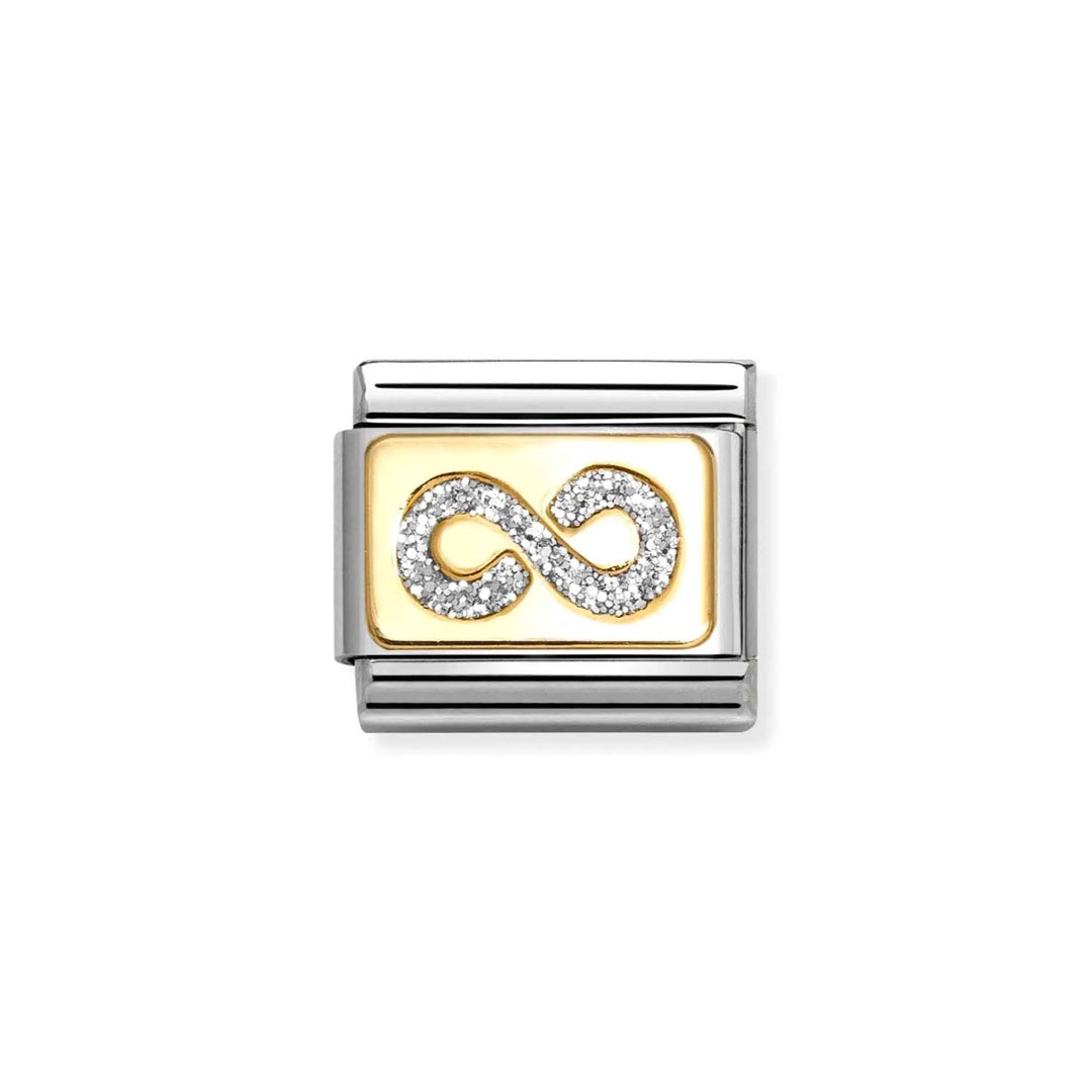 Original Nomination Classic Link in stainless steel and yellow gold with Infinity symbol with Silver Glitter. Made in Italy. This Link is the perfect choice to symbolise a bond that will last forever.