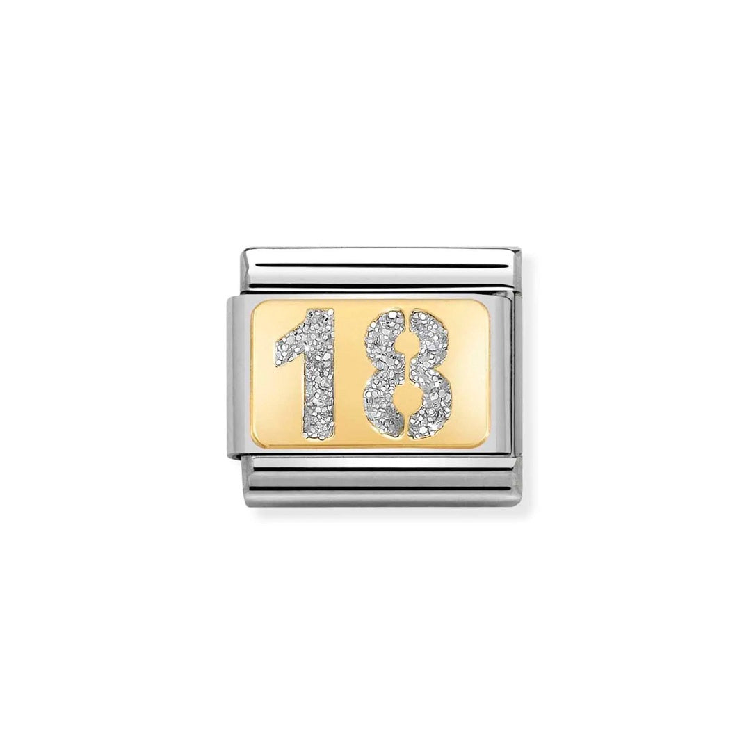 Original Nomination Link for Composable Classic Bracelets in Stainless steel with the Number 18 in glitter enamel and bonded yellow gold details. Made in Italy. This Link is the perfect way to celebrate your favorite gal pal’s big birthday!