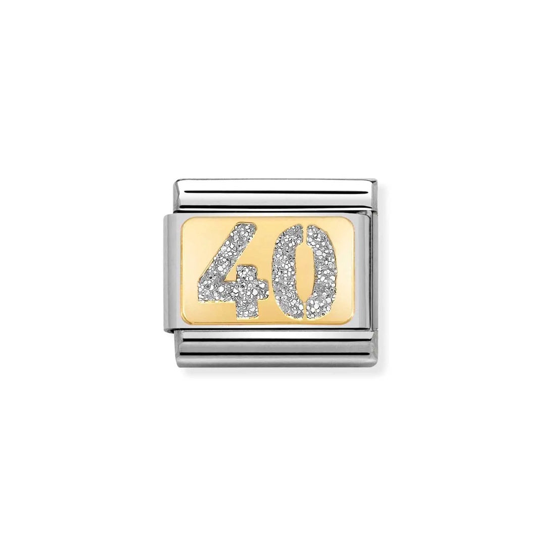Original Nomination Link for Composable Classic Bracelets in Stainless steel with the Number 40 in glitter enamel and bonded yellow gold details. Made in Italy. This Link is for that Fabulous Forty friend that has always got your back.