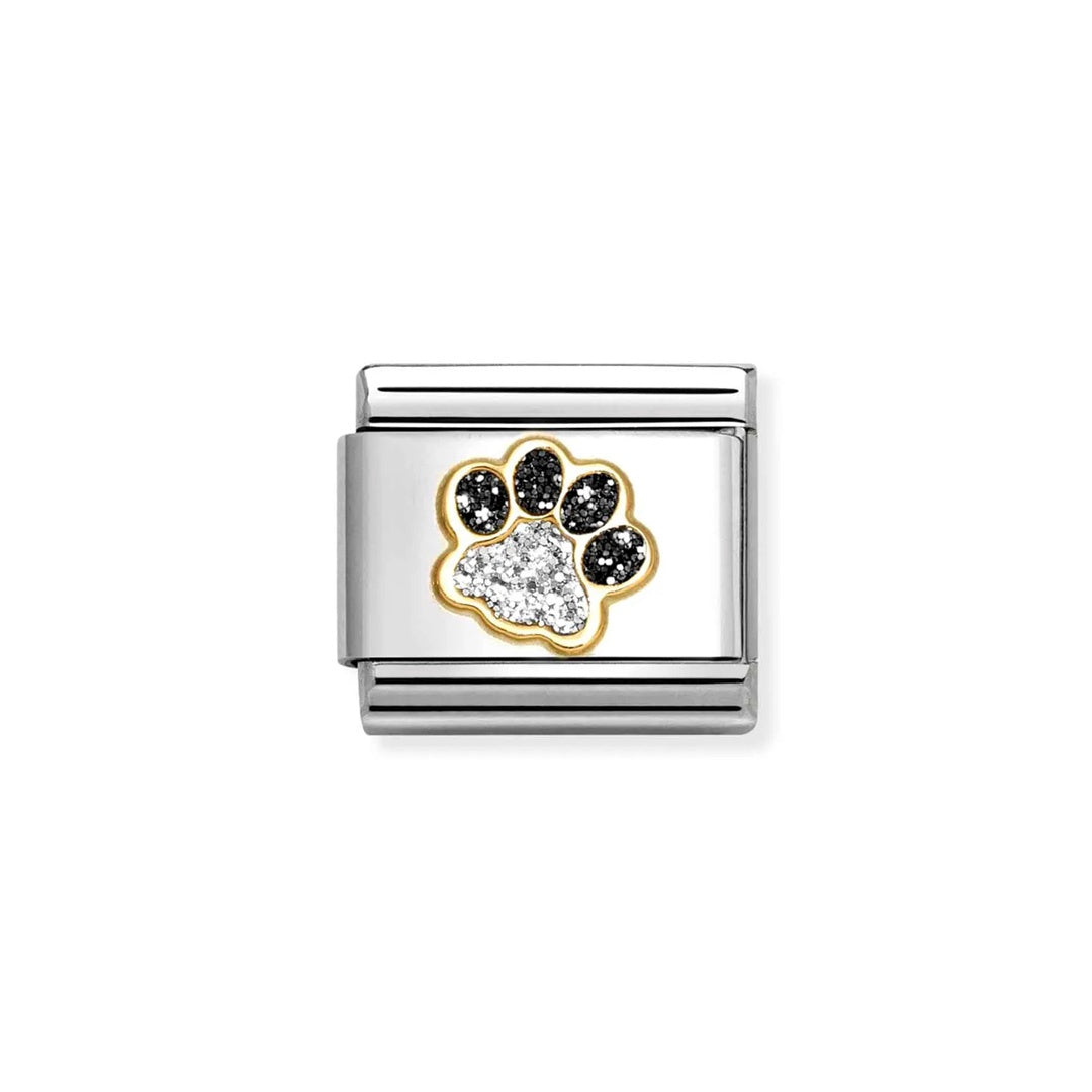 Original Nomination Classic Link in stainless steel and yellow gold with Paw Print symbol with Black and Silver Glitter. Made in Italy. Keep your beloved pet front of mind at all times.