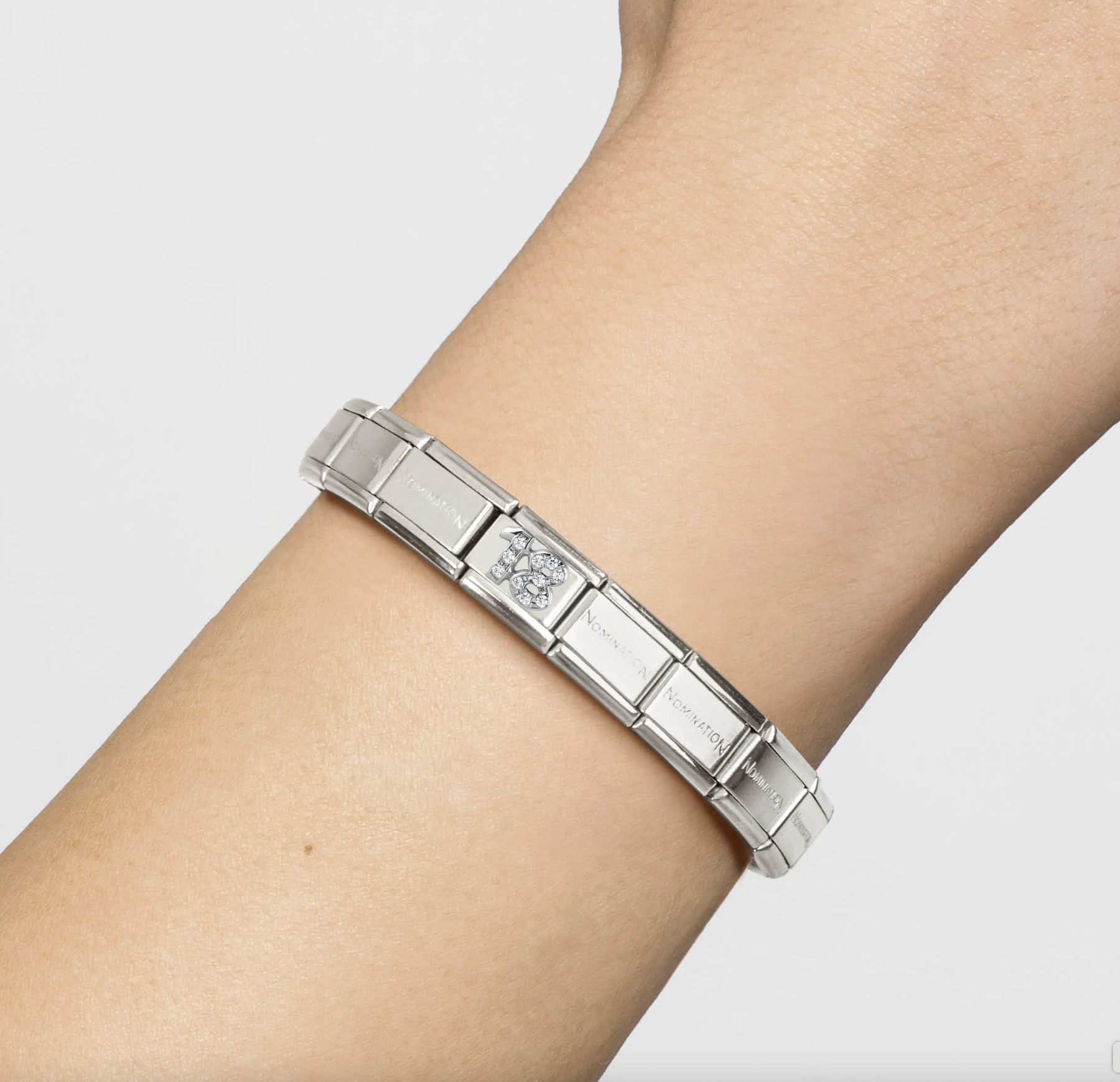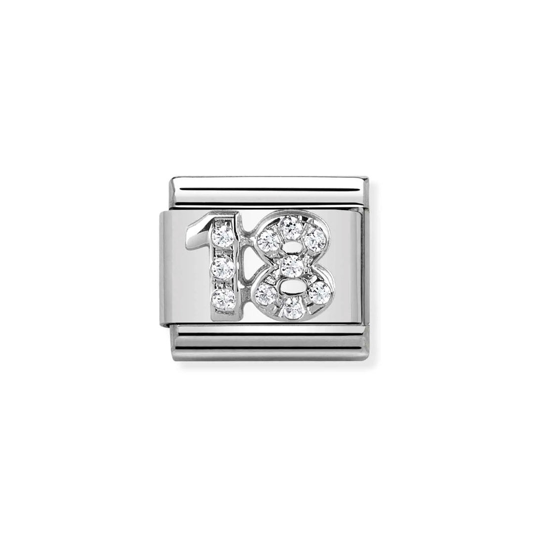 Composable Classic Charm for original bracelet in stainless steel, sterling silver and Cubic Zirconia with number eighteen. Made in Italy. The perfect day for majority birthday.