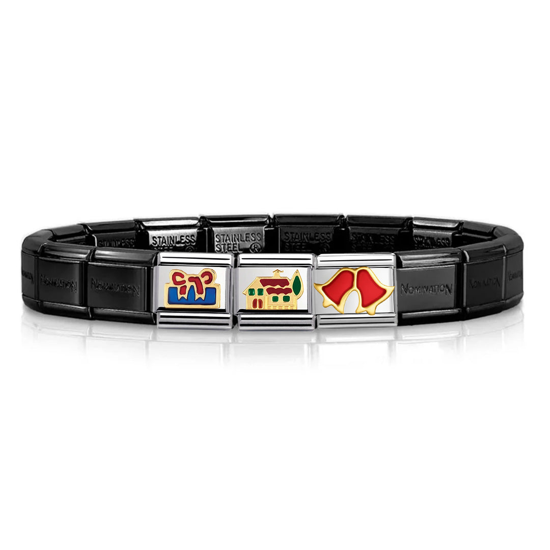 Celebrate the magic of coming home for the season with this pre-constructed Nomination Composable Bracelet. Built on a sleek black stainless steel Classic base, this design features three festive Classic Links: a colorful holiday house, red Christmas bells, and a blue gift box β each crafted with yellow bonded gold and hand-applied enamel for vibrant, nostalgic charm.