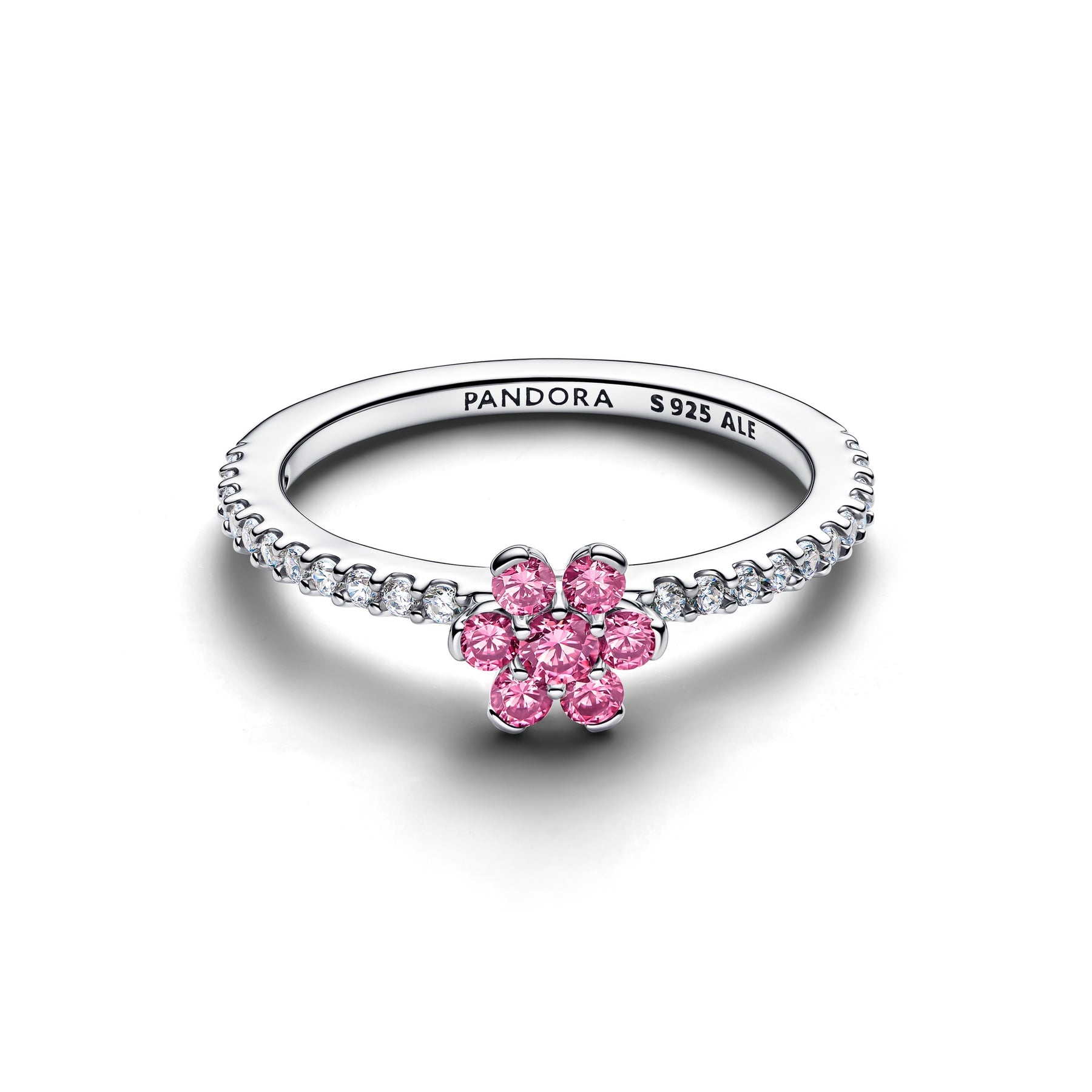 Flourish meets sparkle. Crafted in sterling silver, this ring features a raised flower set with pink stones and a half-pavé band. A sparkling statement that elevates any outfit.