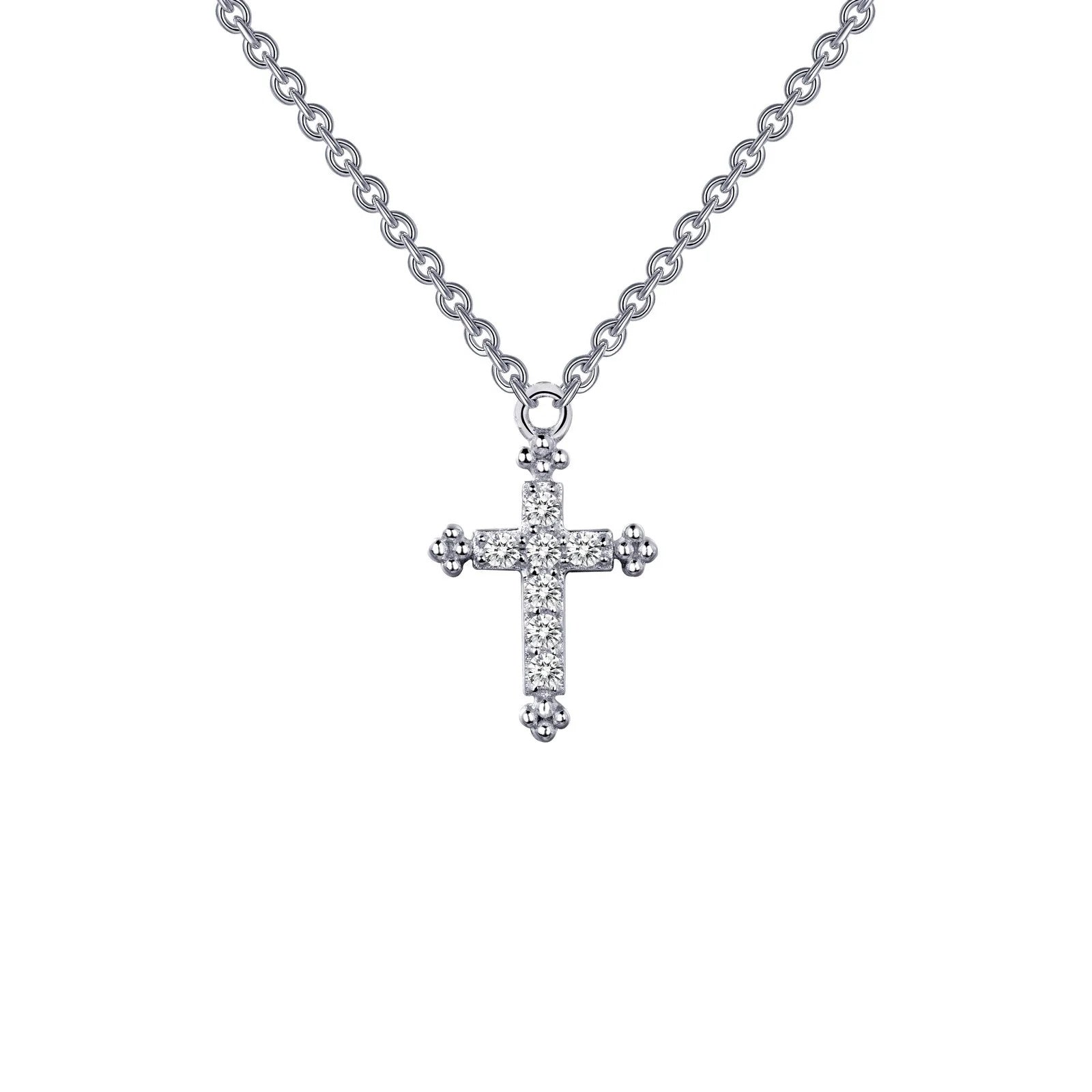 Fashion-forward lifestyle jewelry collection. This designer cross necklace is set with Lafonn's signature Lassaire clear simulated diamonds in sterling silver bonded with platinum.
