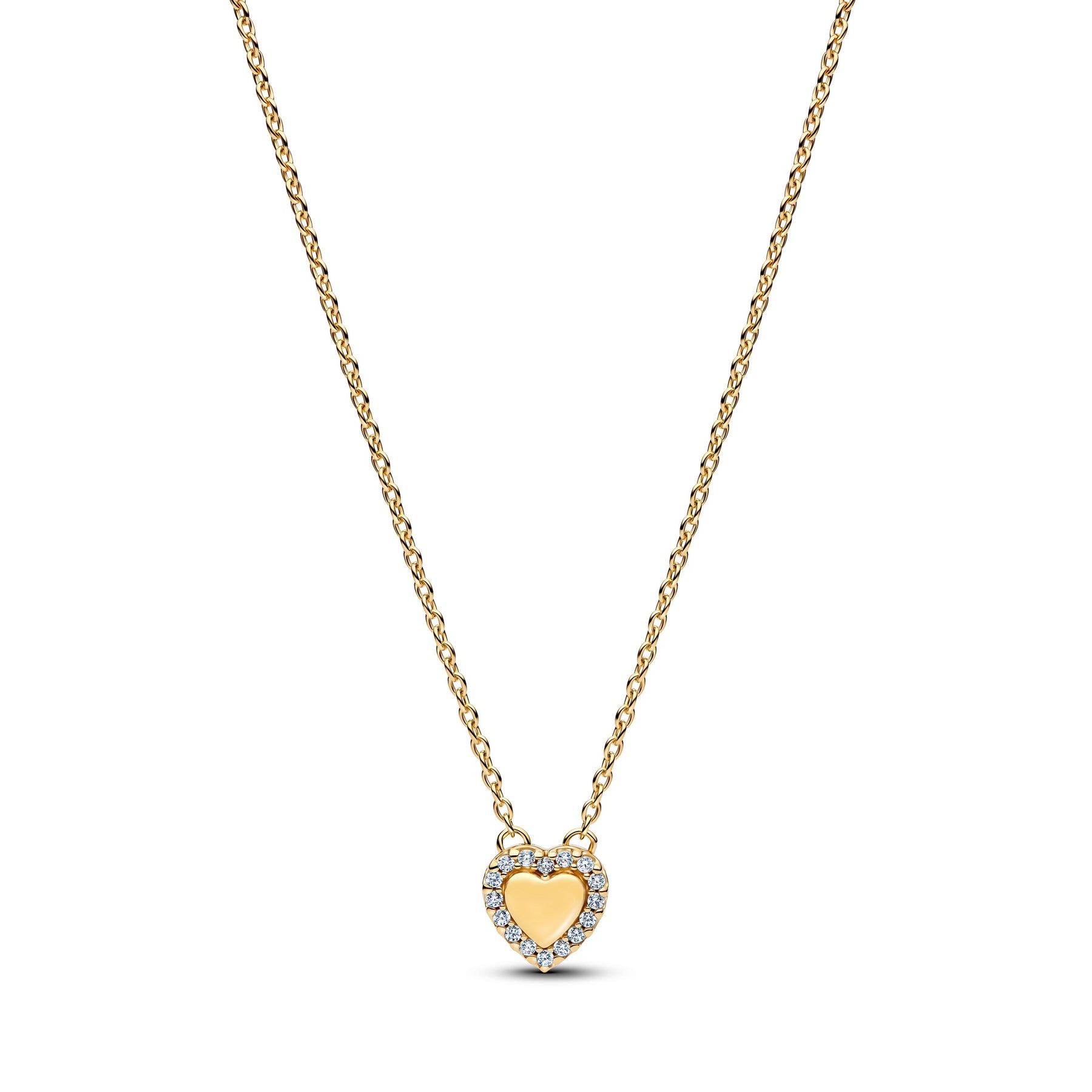 Hold love close. Our 14k gold-plated collier features a centred, engravable heart framed by clear cubic zirconia. Fixed to a delicate cable chain, it’s designed to keep names, dates or sentiments close to your heart.